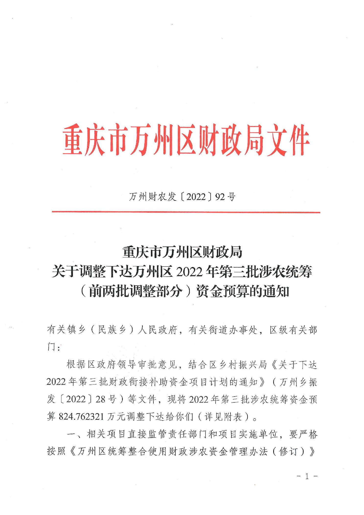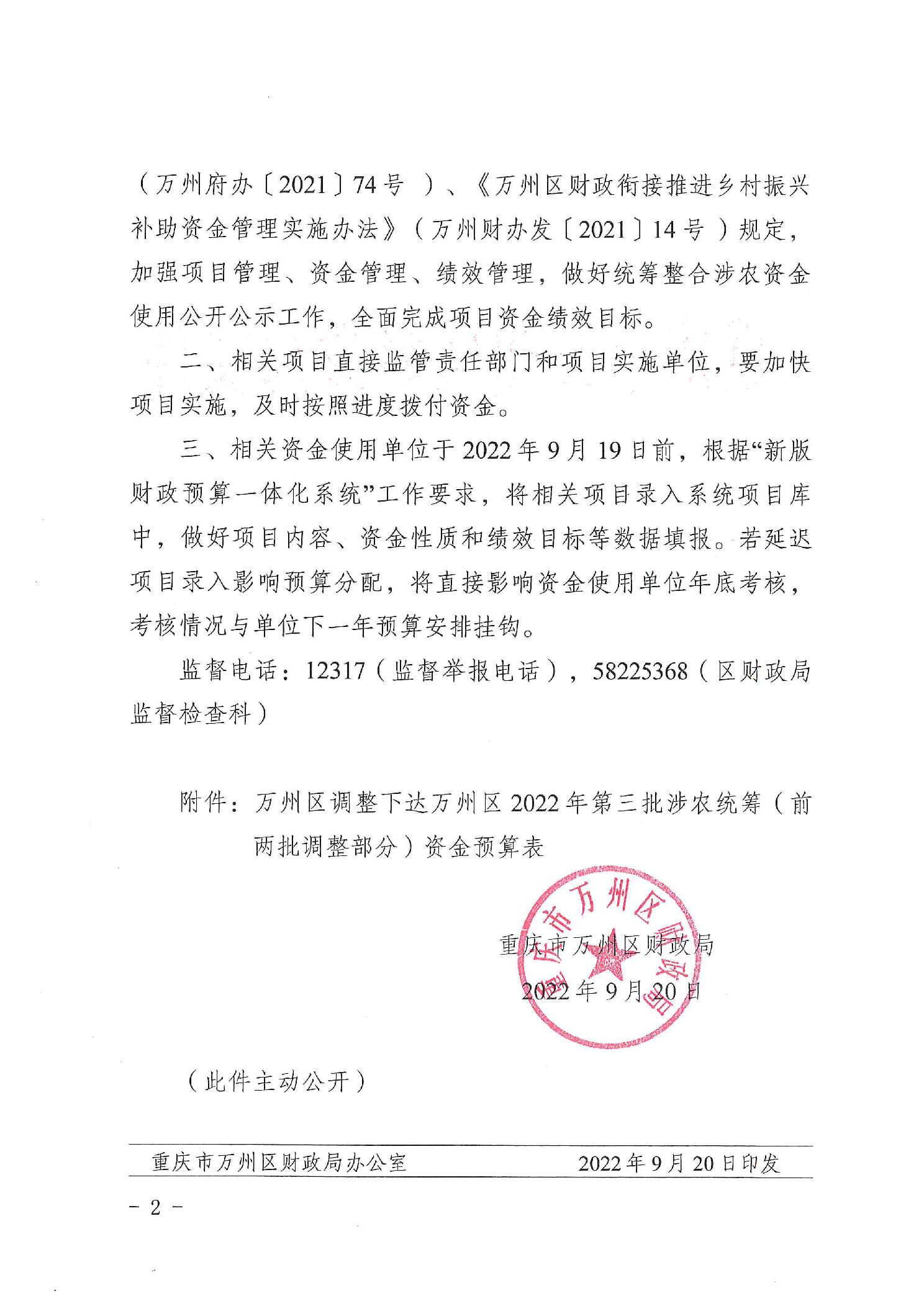重庆市万州区财政局关于调整下达万州区2022年第三批涉农统筹(前两批调整部分)资金预算的通知