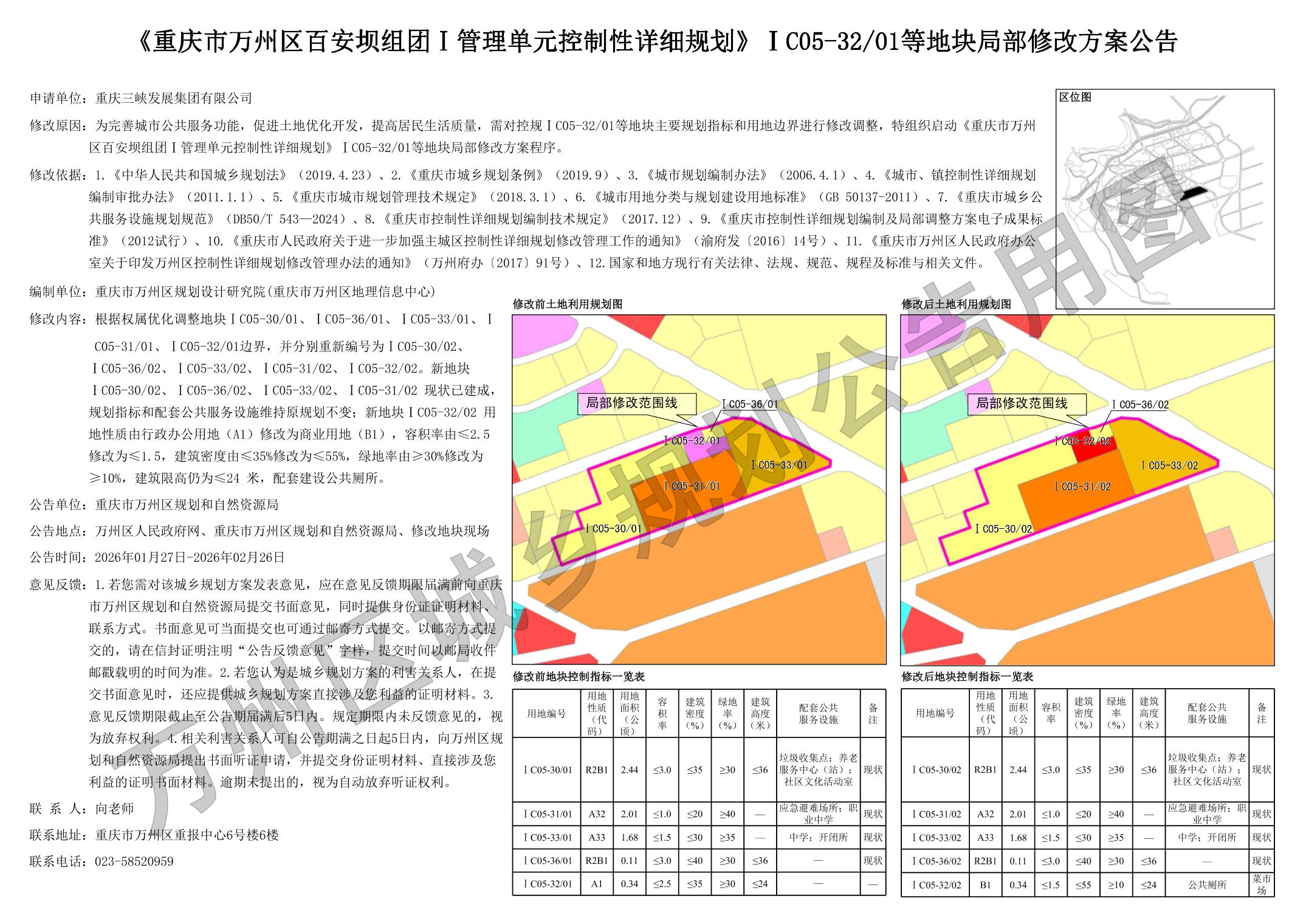 重庆市万州区百安坝组团Ⅰ管理单元控制性详细规划ⅠC05-3201等地块局部修改方案公告