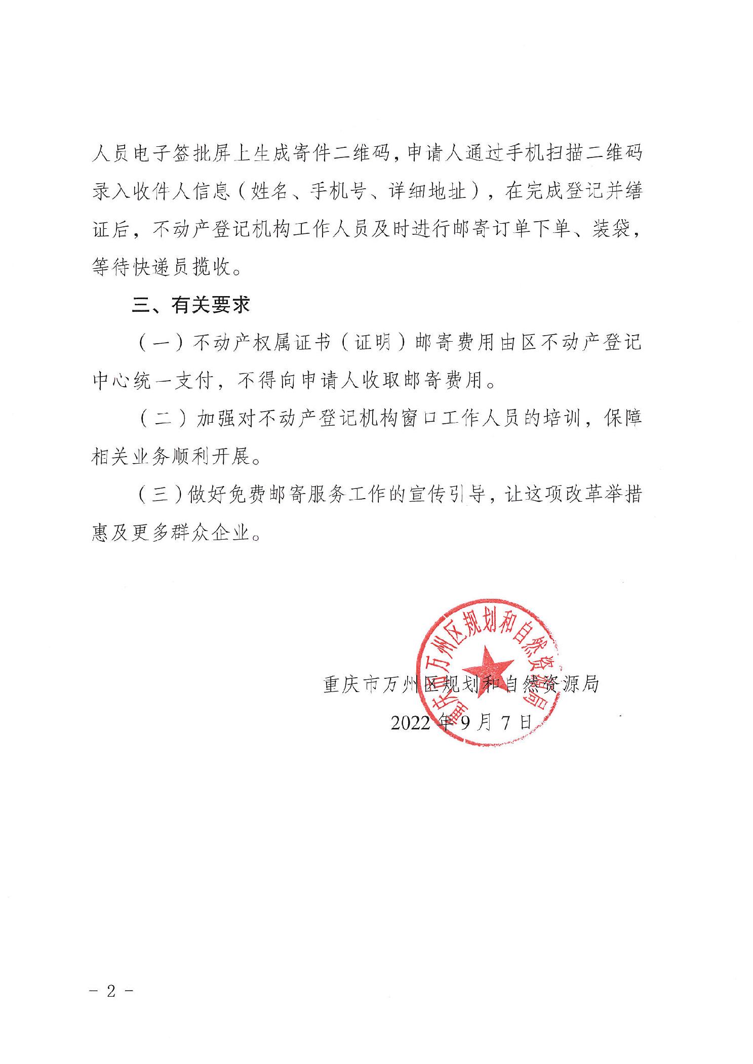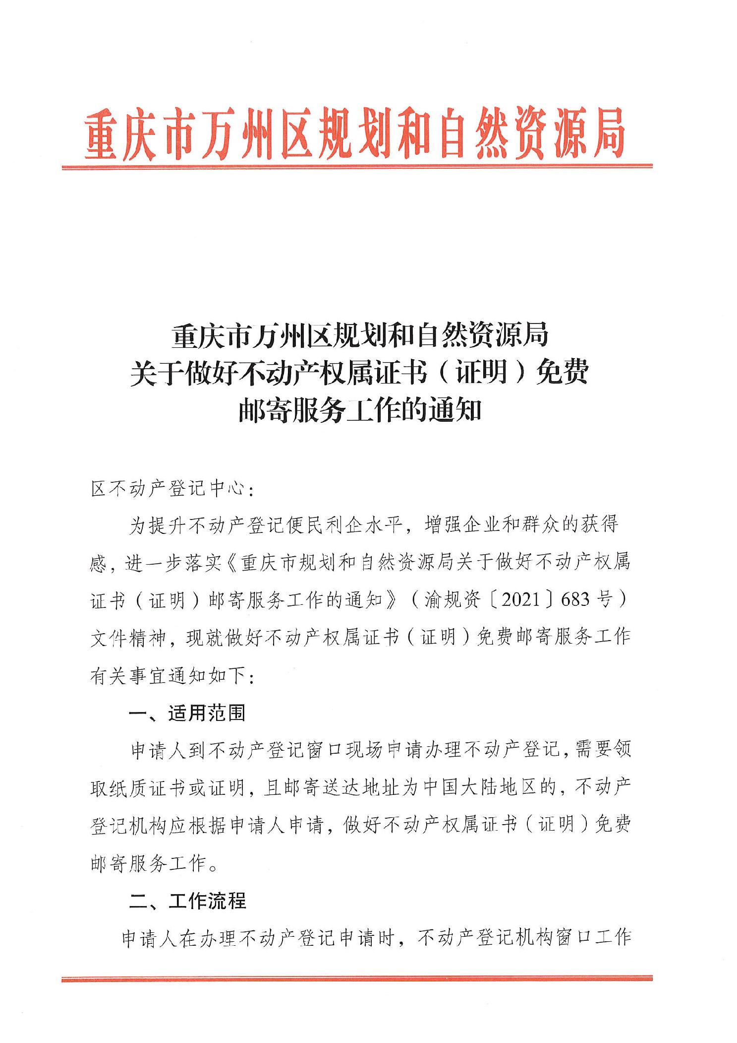 重庆市万州区规划和自然资源局关于做好不动产权属证书(证明)免费 邮寄服务工作的通知