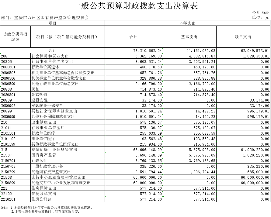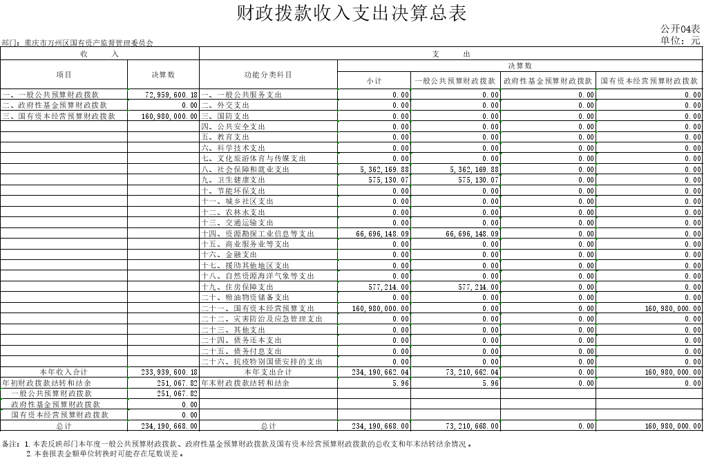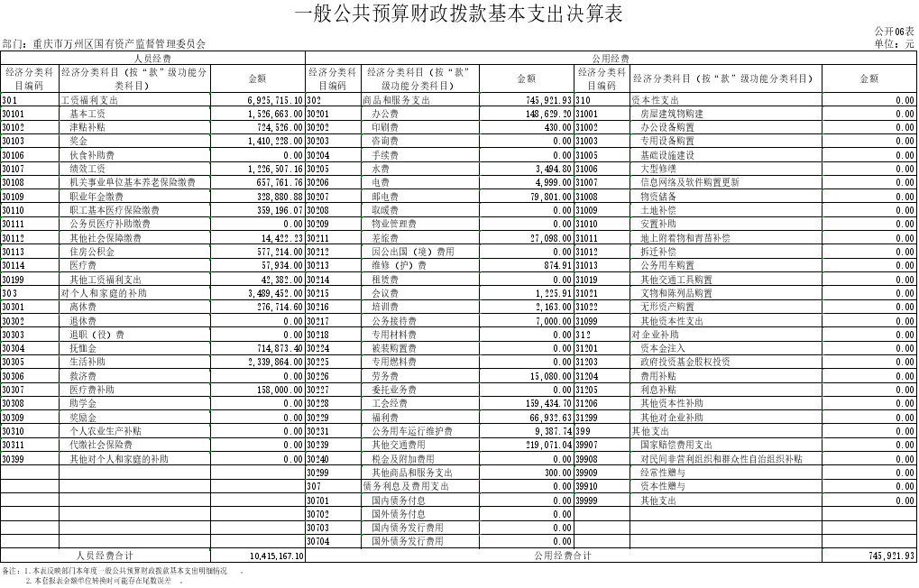 3. 结转结余情况。2024年度年末一般公共预算财政拨款结转和结余0.00万元,与2023年决算数相比减少0.11万元,下降100.00%,主要原因是归垫了万州区国有资产管理中心用预算内资金垫付的职工个人计提部分。
