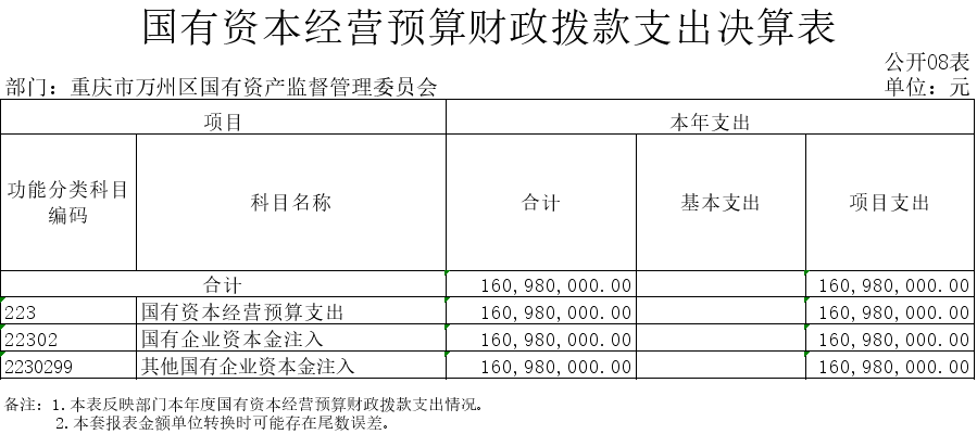 2024年度国有资本经营预算财政拨款支出合计16098万元,其中:基本支出0.00万元,项目支出16098万元,主要用于拨付重庆三峡资本运营集团有限公司注册资本金2800万元、万州资产经营有限公司注册资本金6698万元、重庆建环实业集团有限公司注册资本金6200万元、万州住房租赁有限公司注册资本金400万元。
