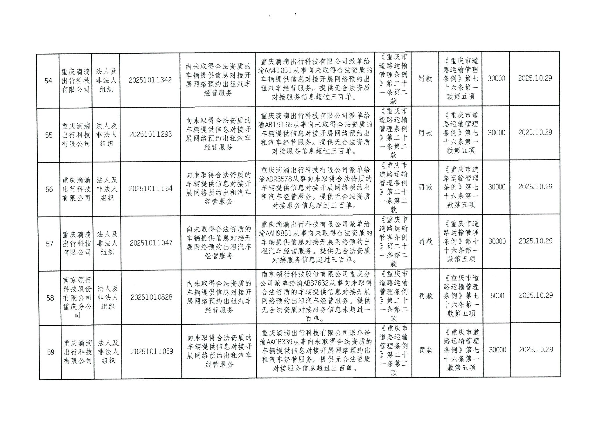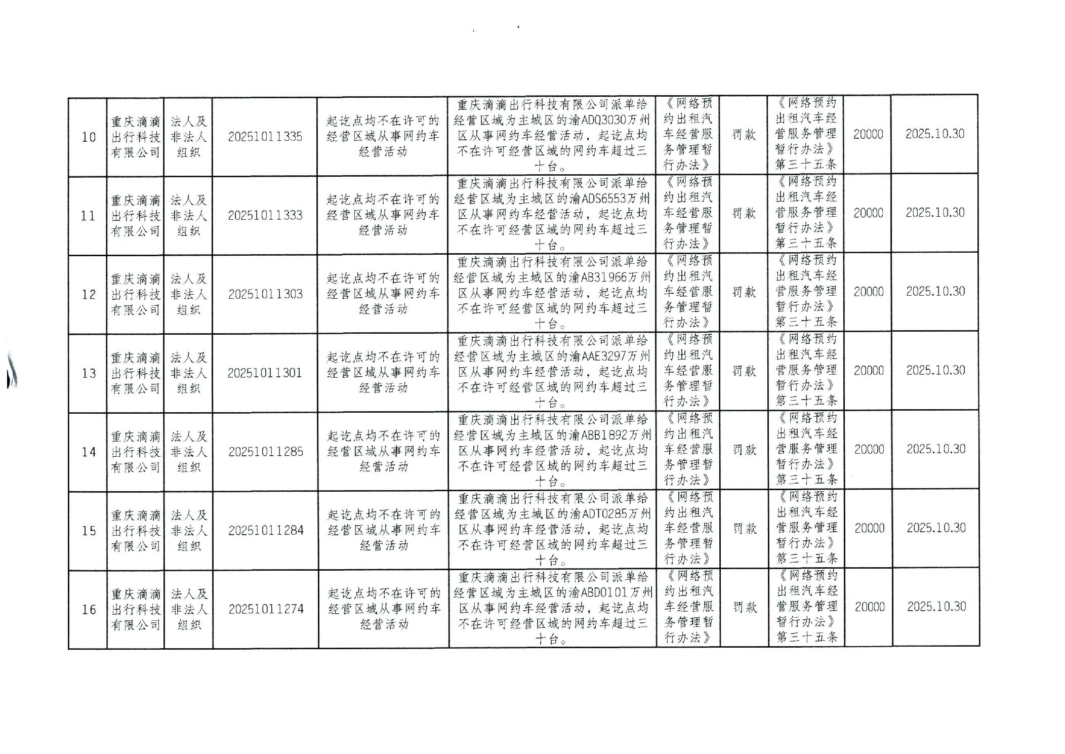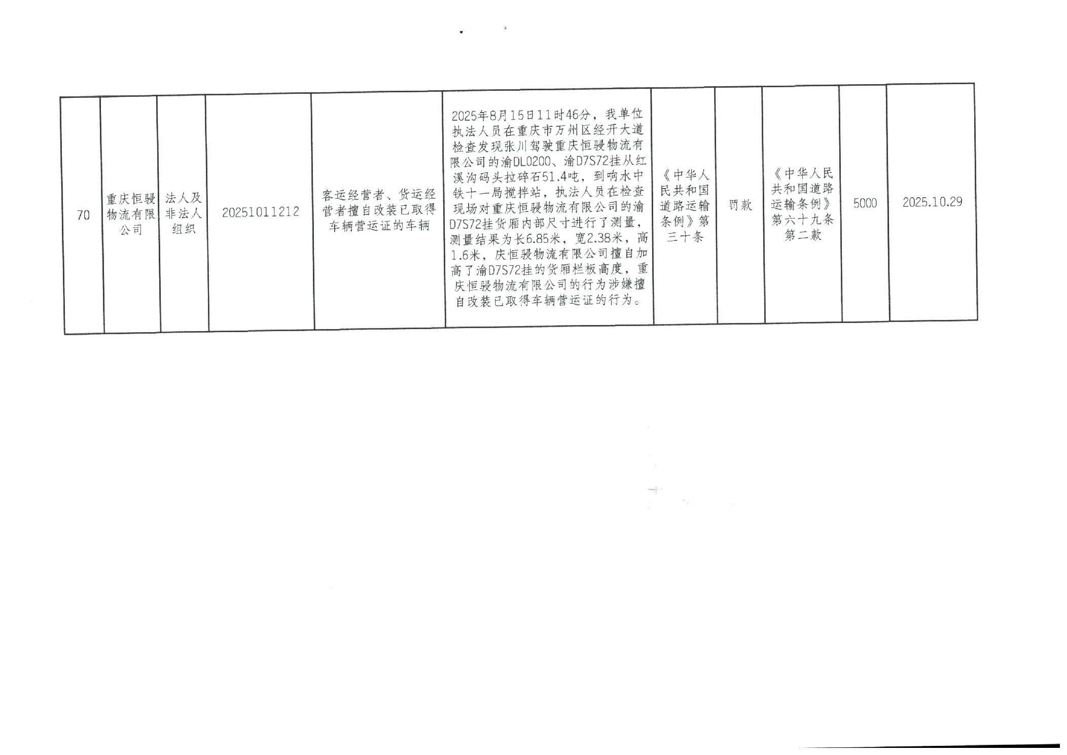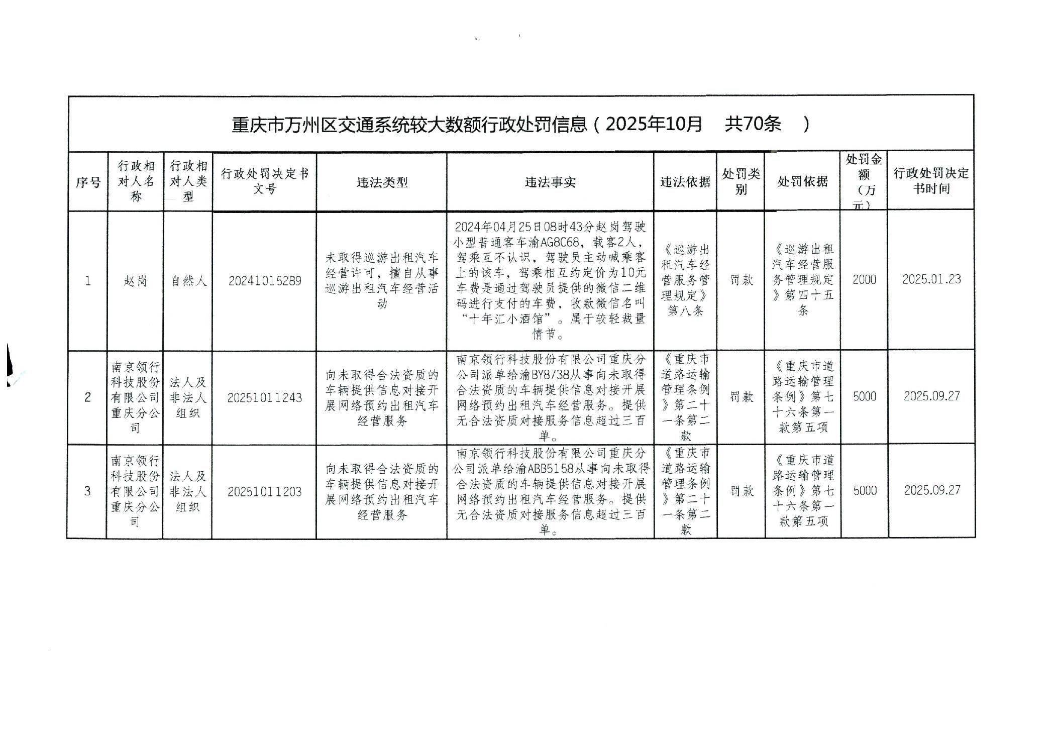 重庆市万州区交通系统较大数额行政处罚信息(2025年10月)