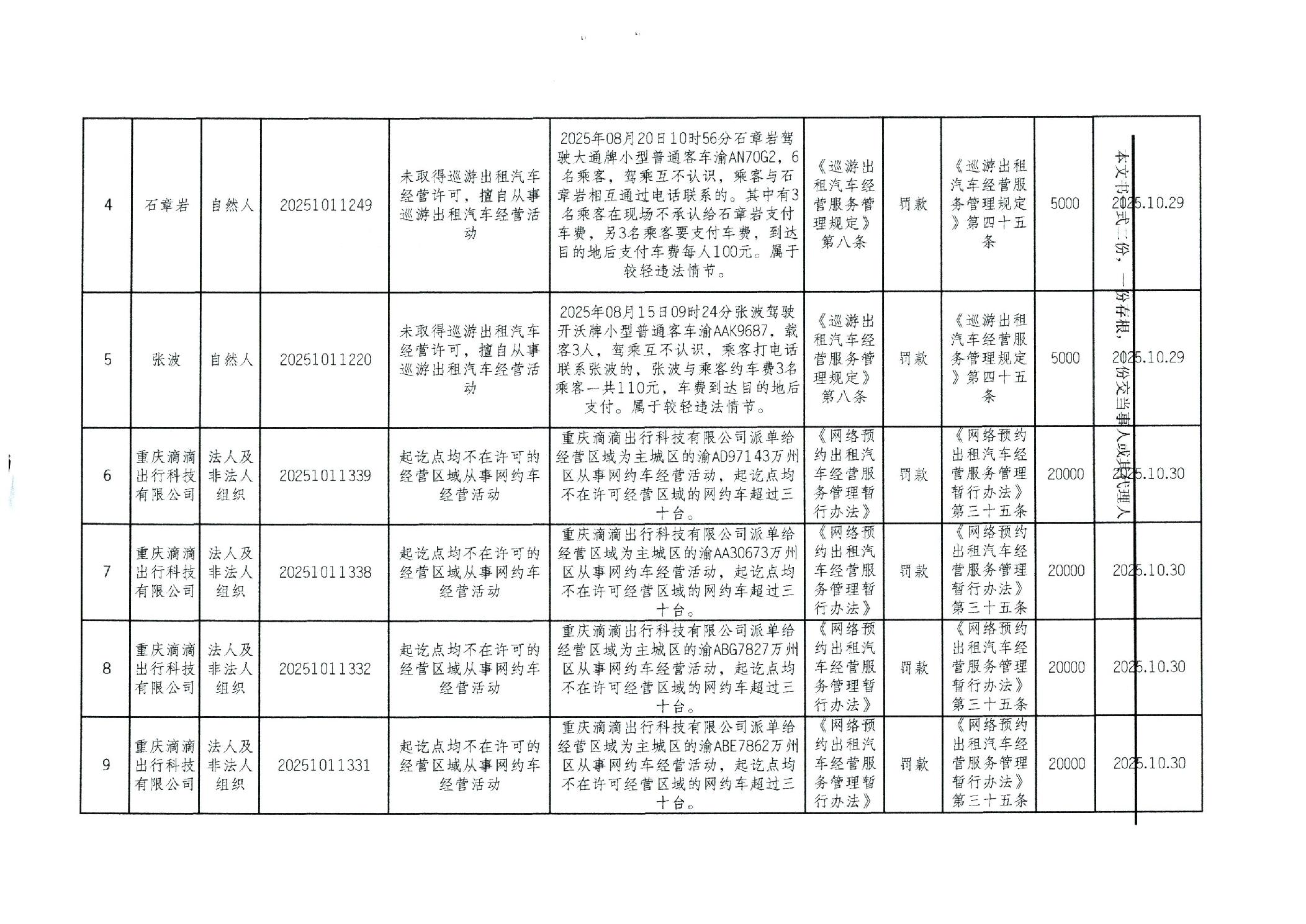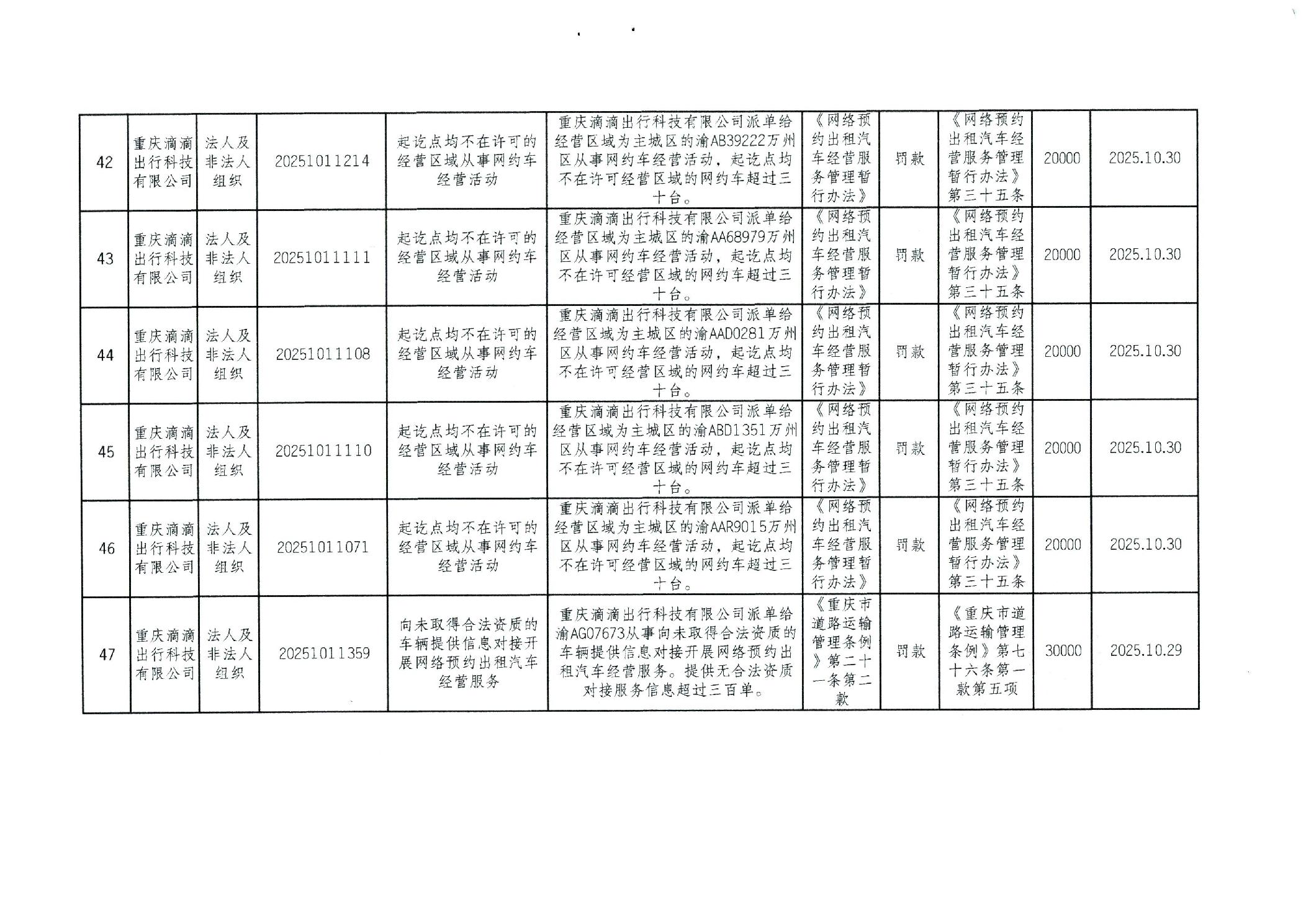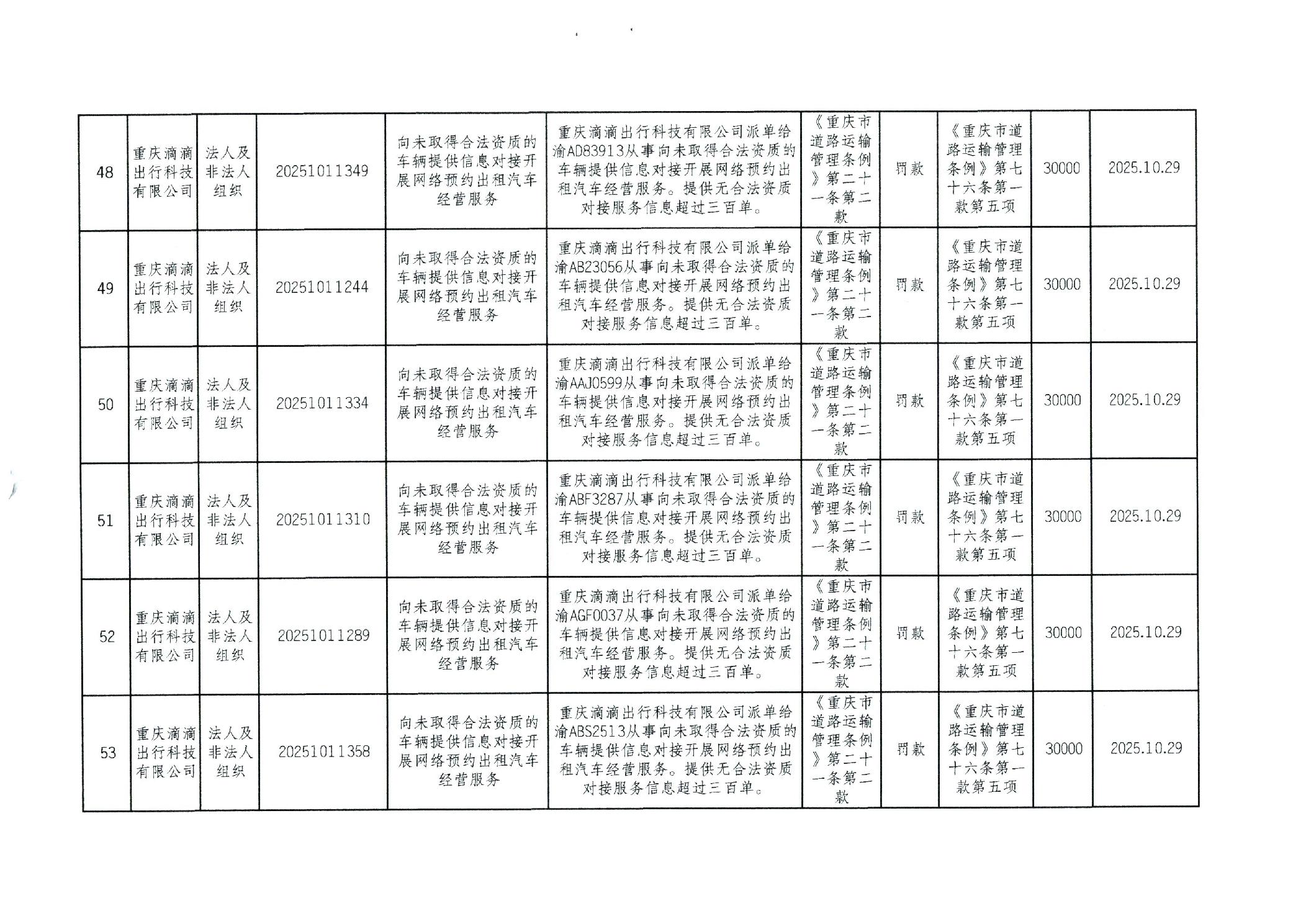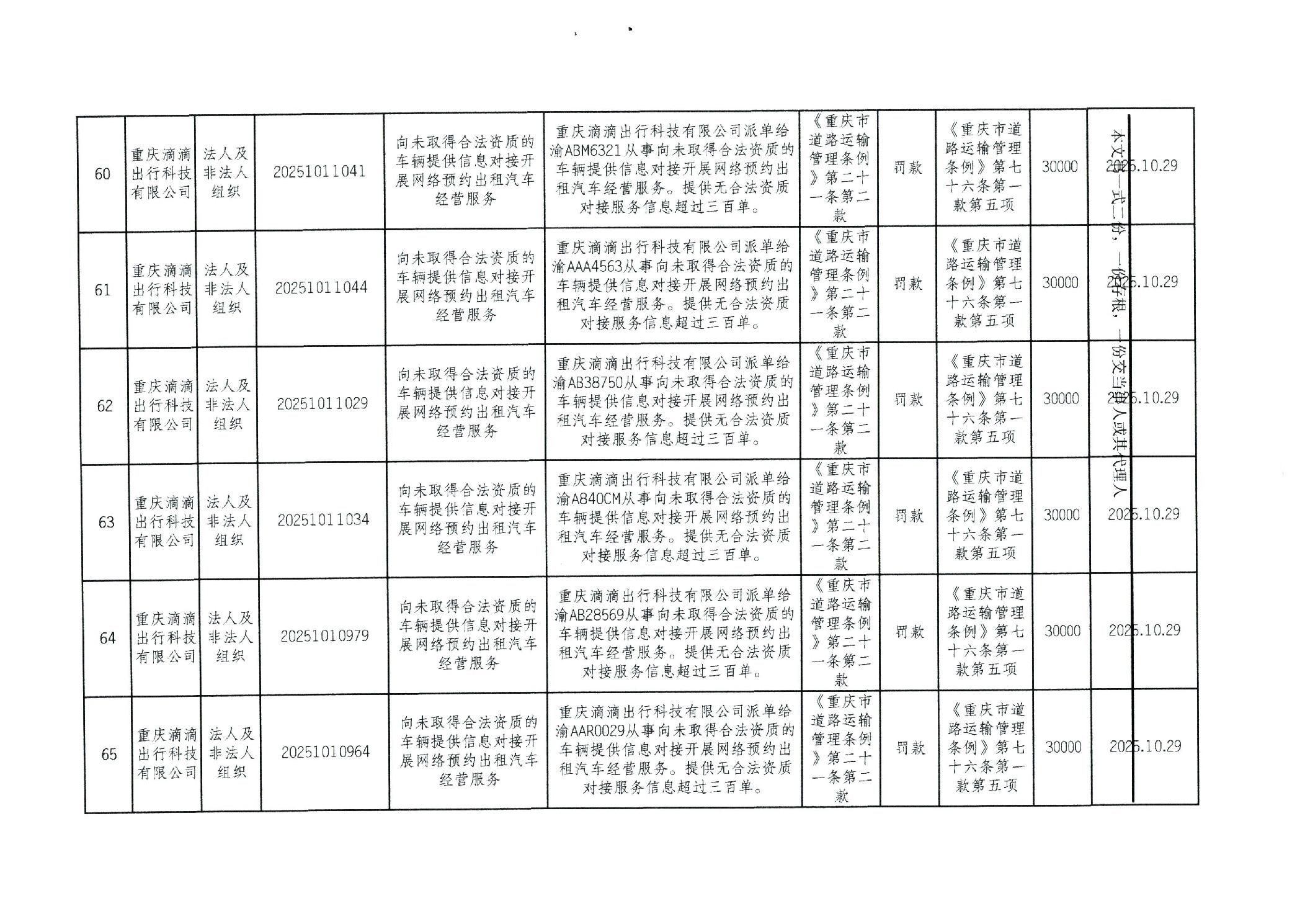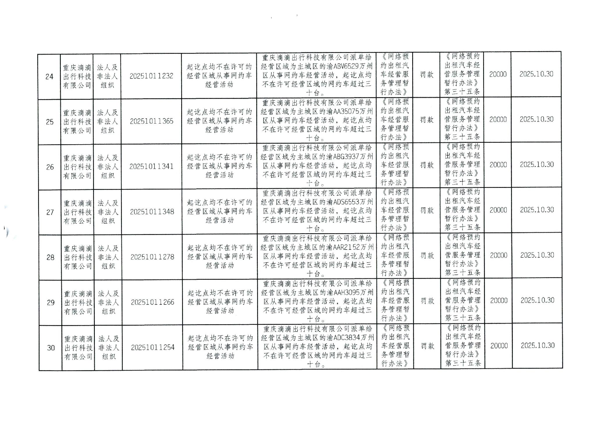 重庆市万州区交通系统较大数额行政处罚信息(2025年10月)
