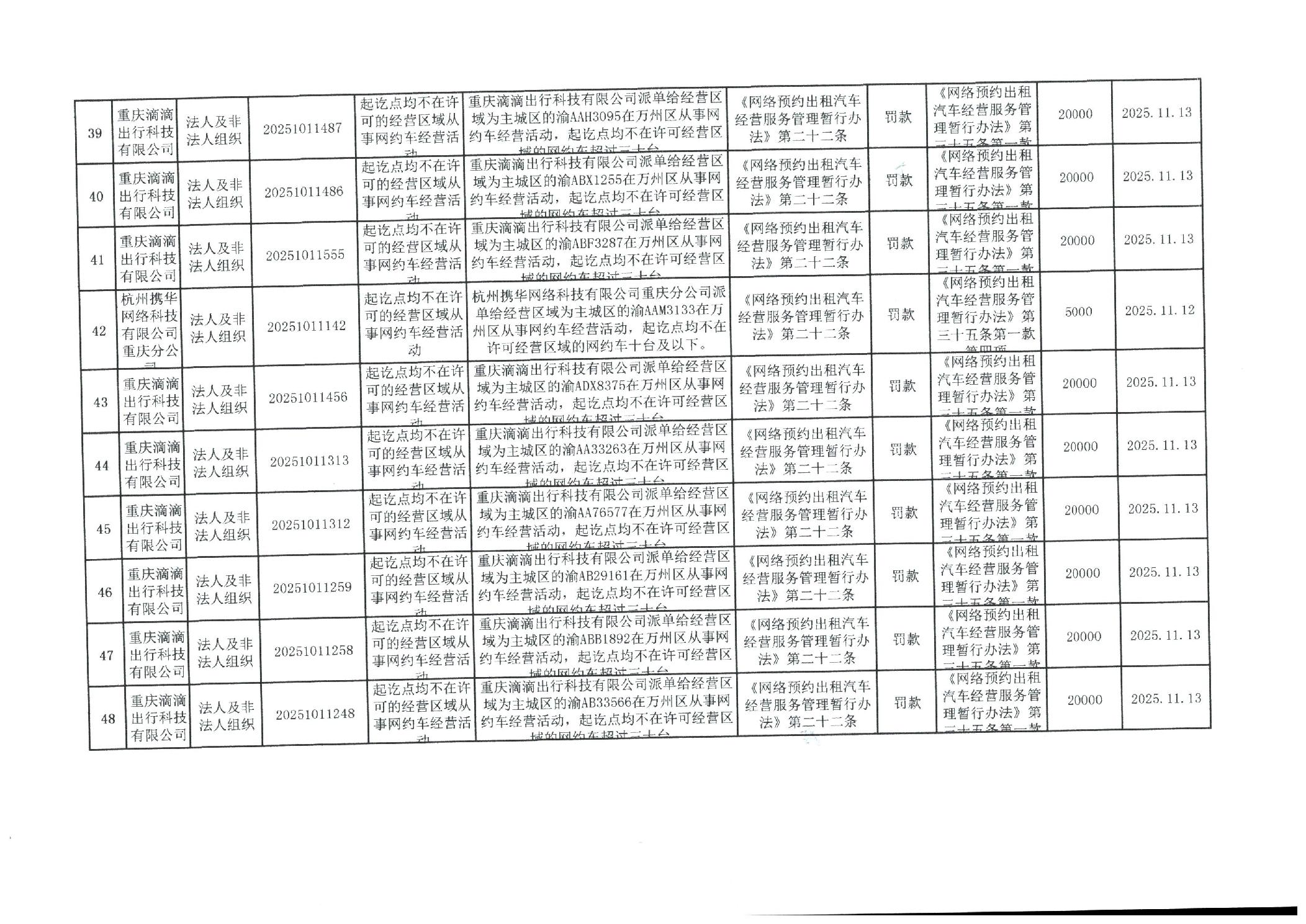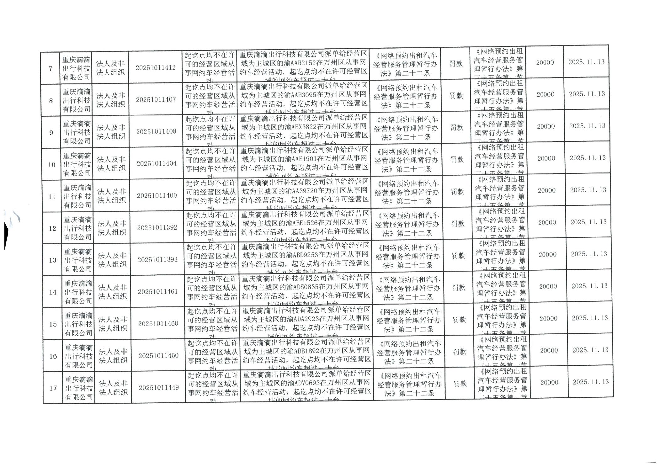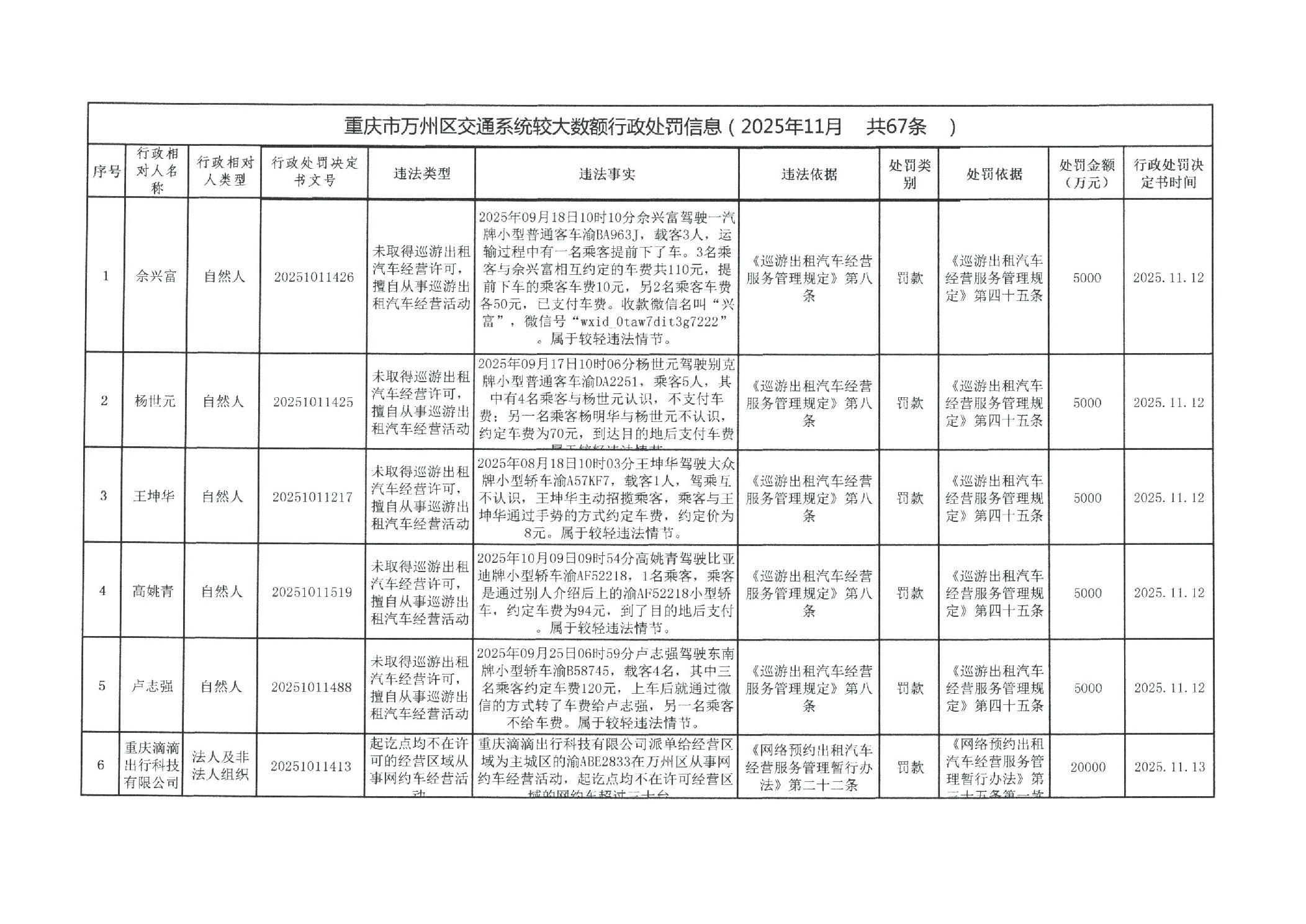 重庆市万州区交通系统较大数额行政处罚信息(2025年11月)