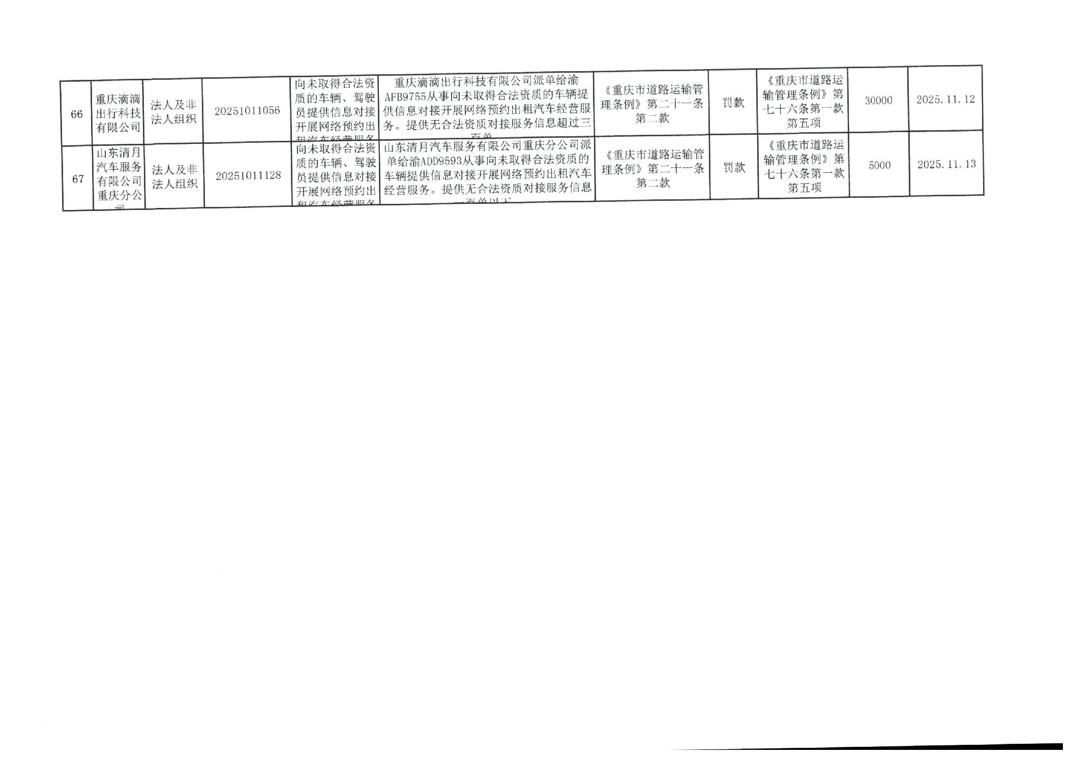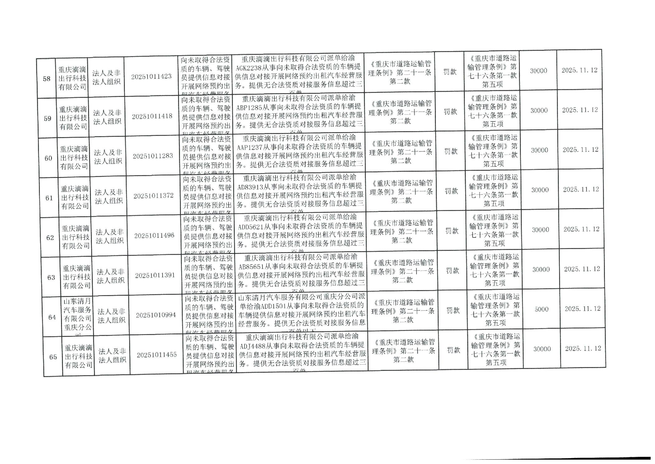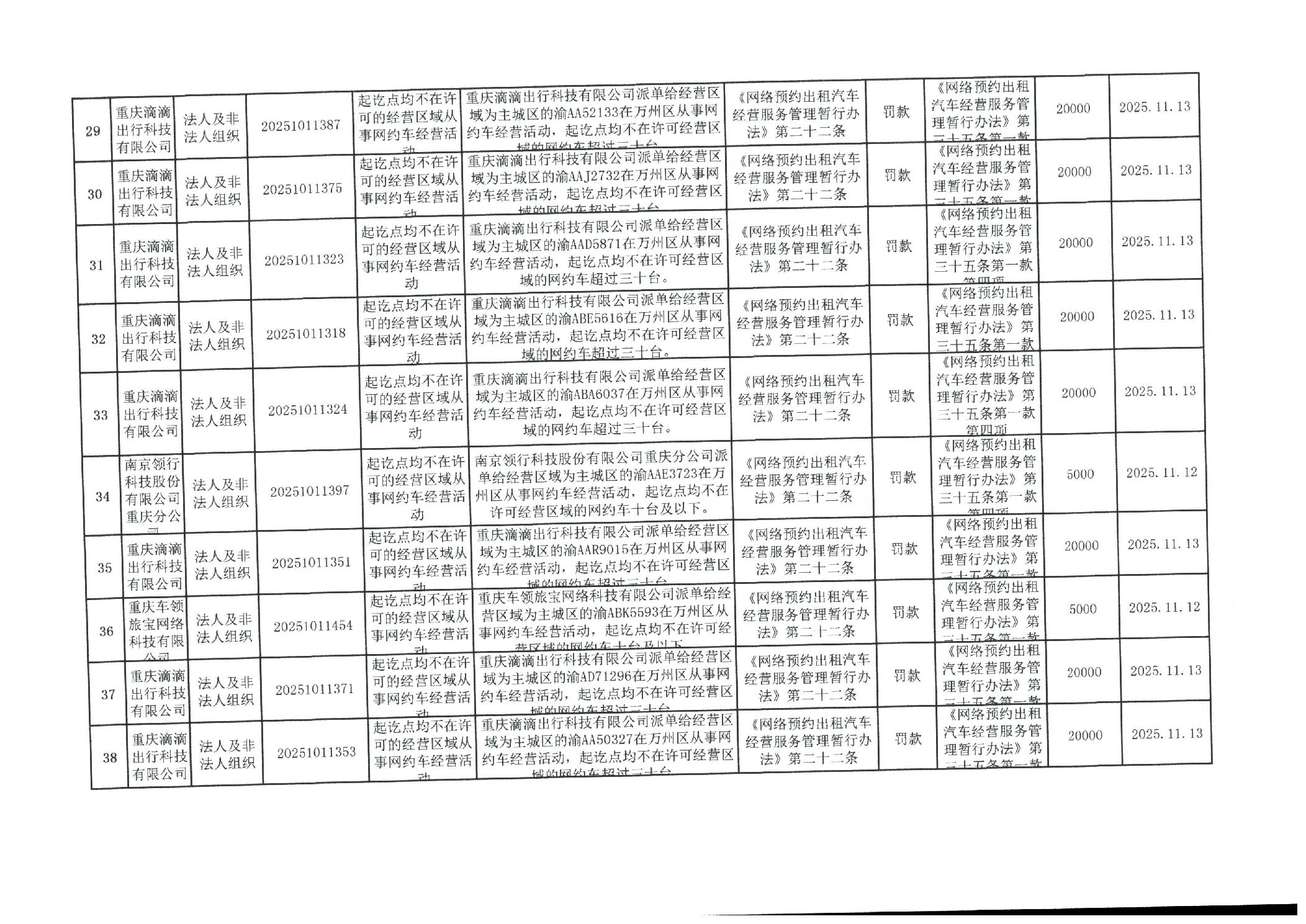 重庆市万州区交通系统较大数额行政处罚信息(2025年11月)