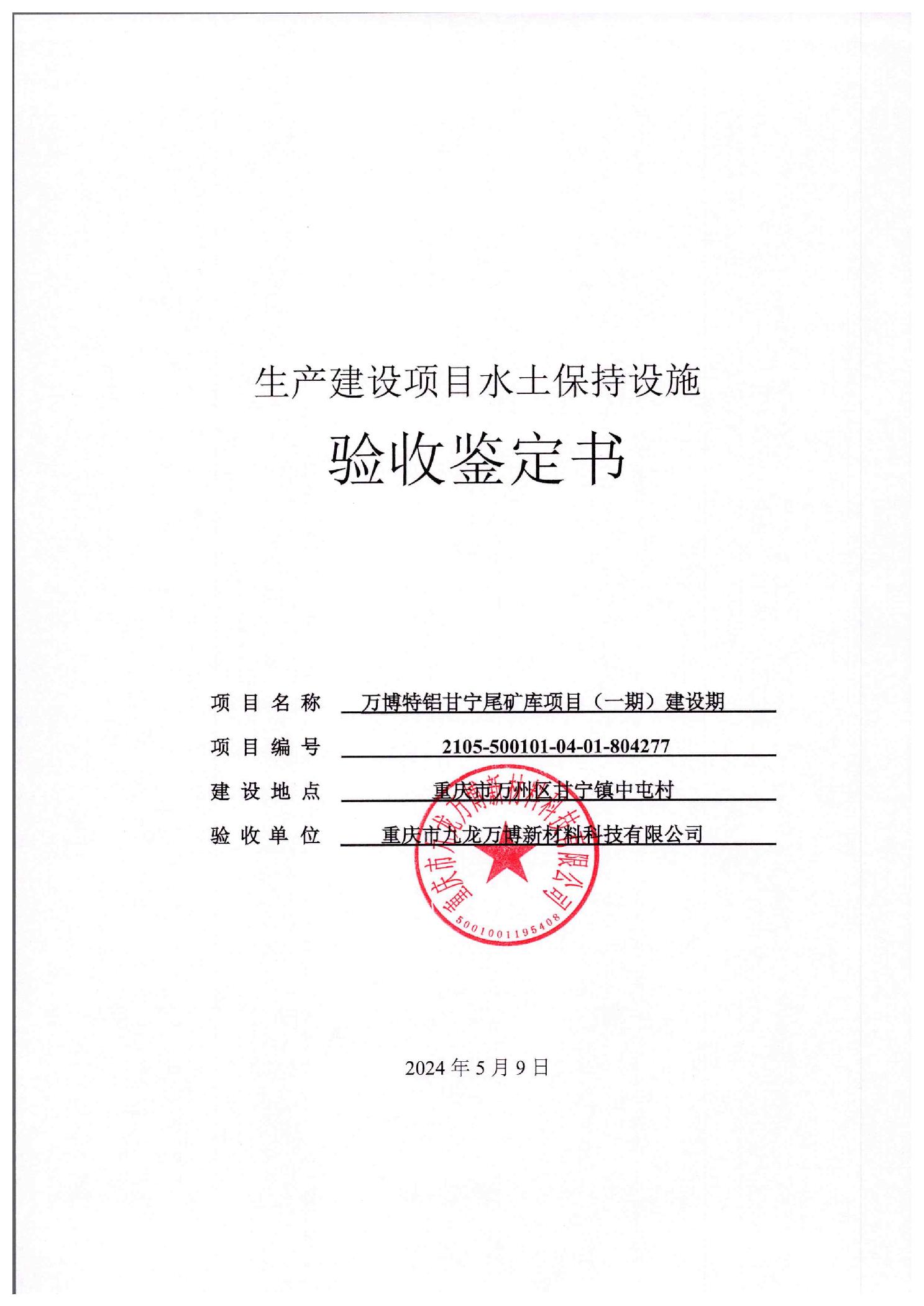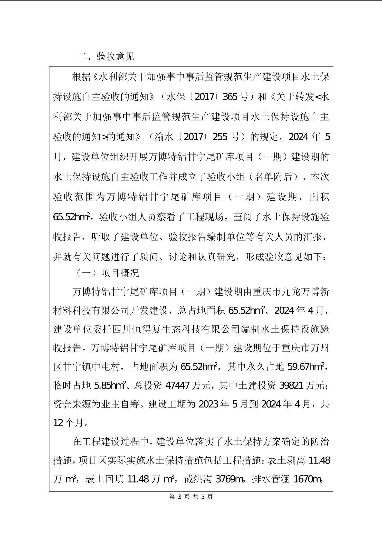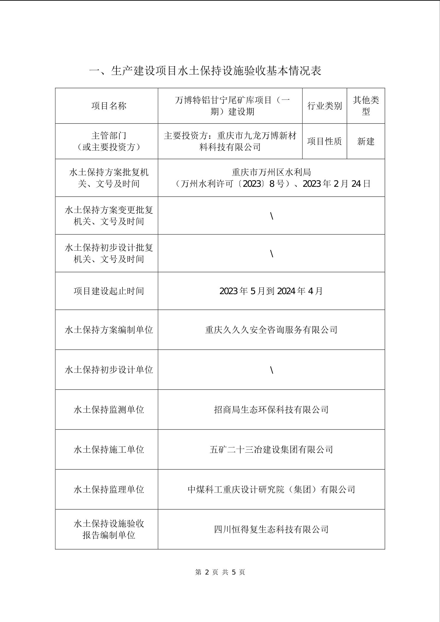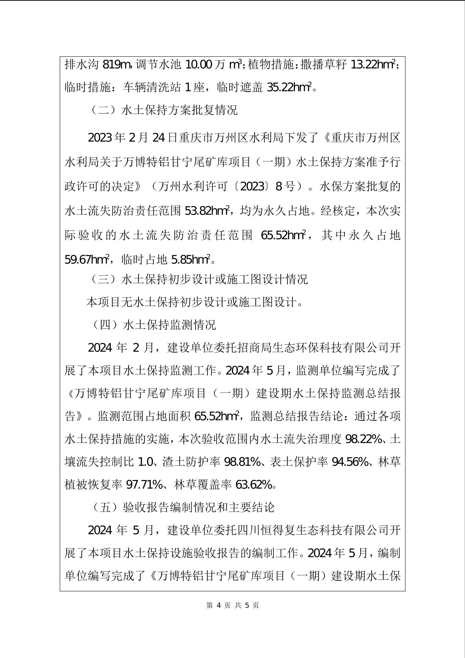 万州区生产建设项目水土保持设施自主验收公示(万博特铝甘宁尾矿库项目(一期))