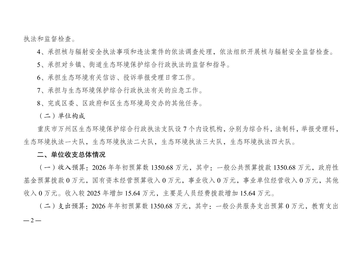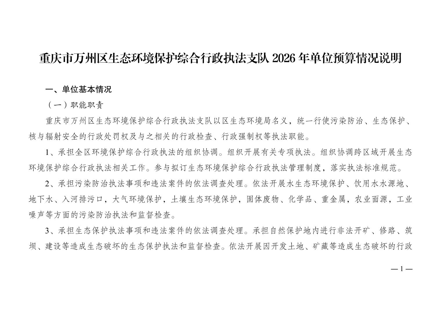 重庆市万州区生态环境保护综合行政执法支队2026年单位预算情况说明