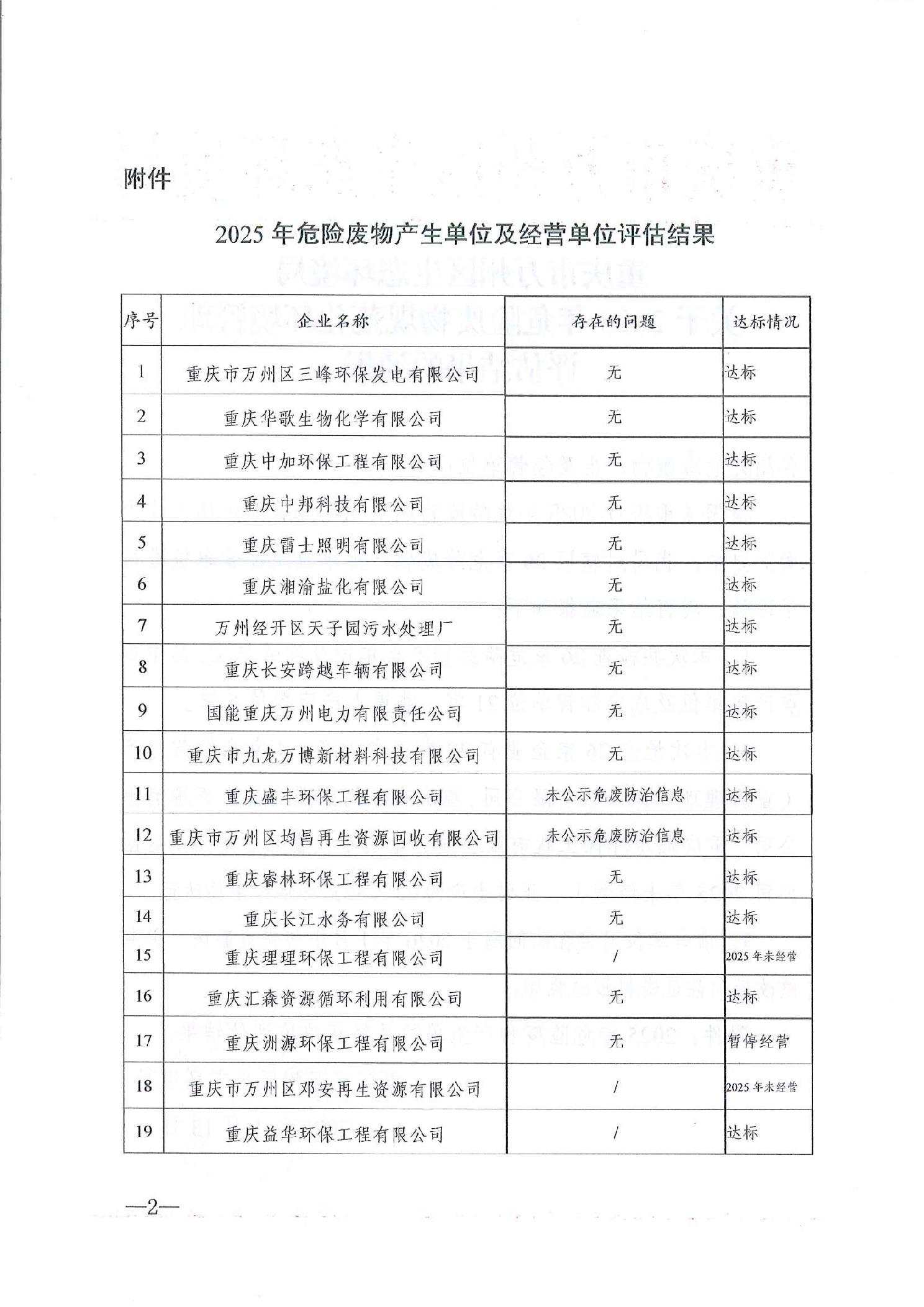 重庆市万州区生态环境局关于2025年危险废物产生重点单位及经营单位规范化管理抽查考核结果的通报
