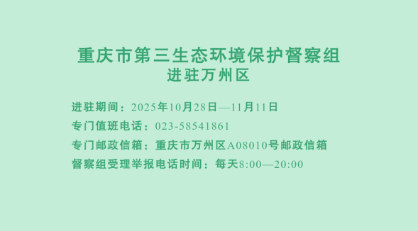 根据工作安排,重庆市第三生态环境保护督察组进驻时间为15天。进驻期间(2025年10月28日—11月11日)设立专门值班电话:023-58541861,专门邮政信箱:重庆市万州区A08010号。督察组受理举报投诉电话时间为每天8:00—20:00。根据督察安排,督察组主要受理万州区生态环境保护方面的来信来电信访举报,其他不属受理范围的信访举报问题,将按规定交由万州区按程序办理。