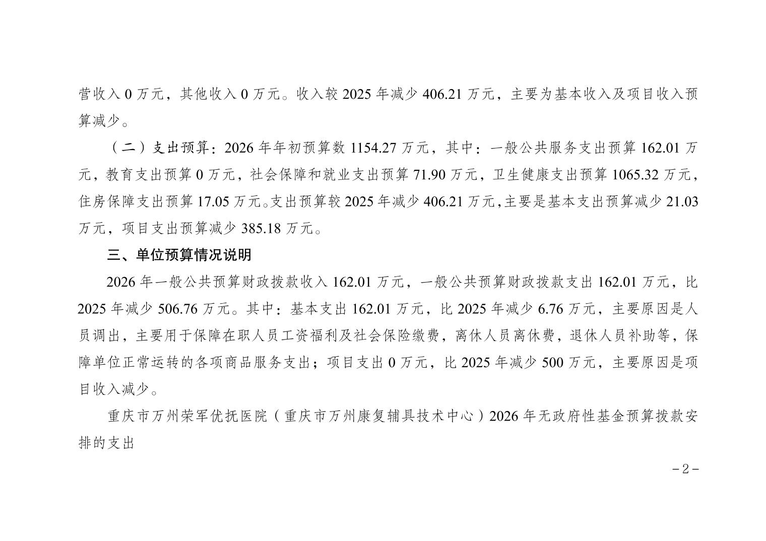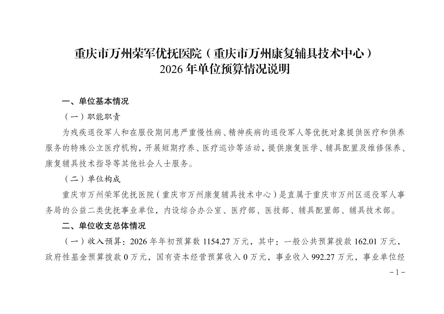 重庆市万州荣军优抚医院(重庆市万州康复辅具技术中心) 2026年单位预算情况说明