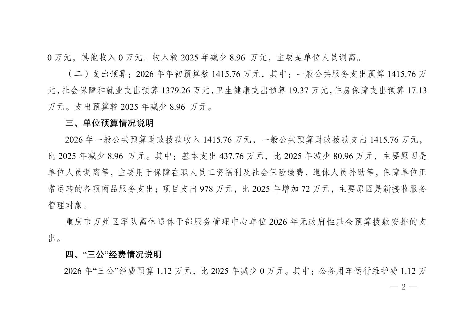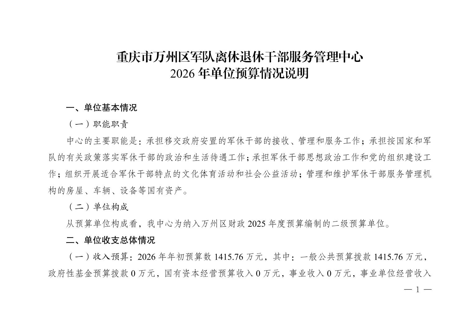 重庆市万州区军队离休退休干部服务管理中心2026年预算情况说明