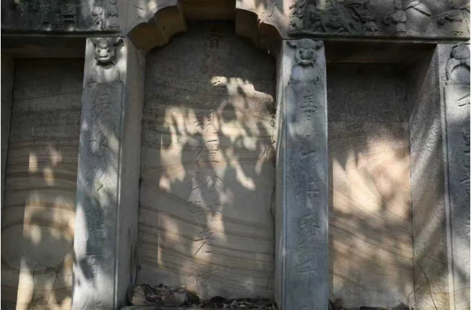 明间碑面两侧楹柱阴刻楹联,内容为“青山拱秀千秋□,绿水□阳百代兴”。左右两侧楹柱楷书阴刻楹联,文字内容为“千里龙来生吉地,万代荣昌□□泉”。二层门匾处从右至左分别楷书阴刻“百世”“极乐宫”“流芳”等字样。一层门匾处楷书阴刻“福”字,两侧浮雕人物造像。墓冢残高1.9米,长、宽均为8.2米。