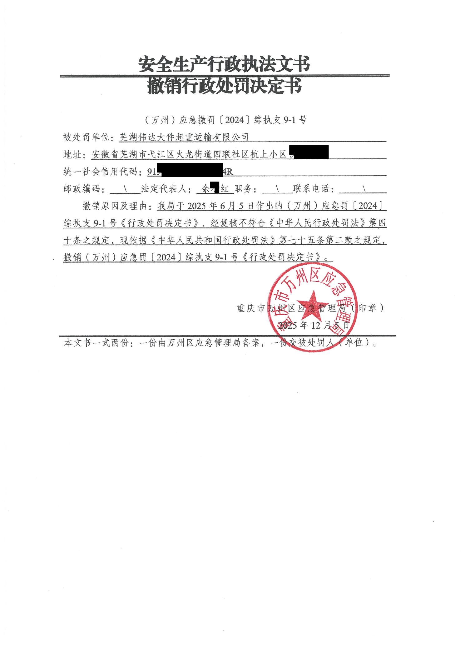 重庆市万州区应急管理局撤销行政处罚决定书(万州应急撤罚〔2024〕综执支9-1号)