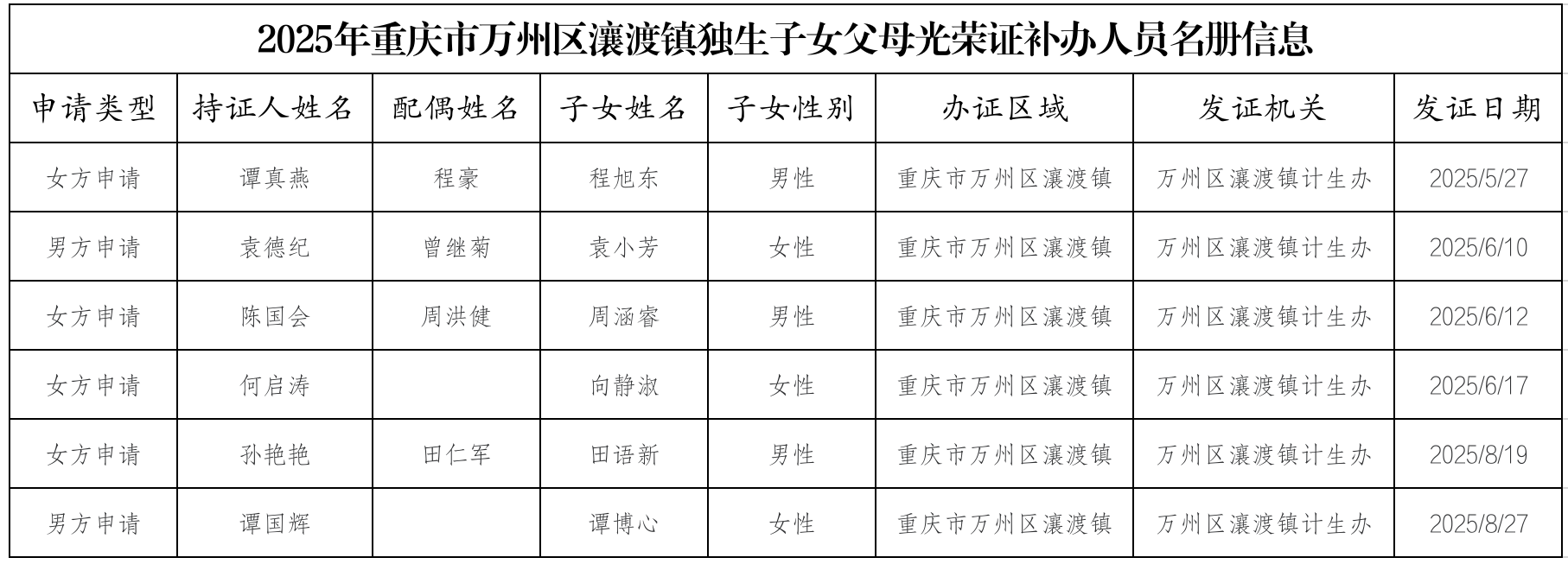 2025年重庆市万州区瀼渡镇独生子女父母光荣证补办人员名册信息
