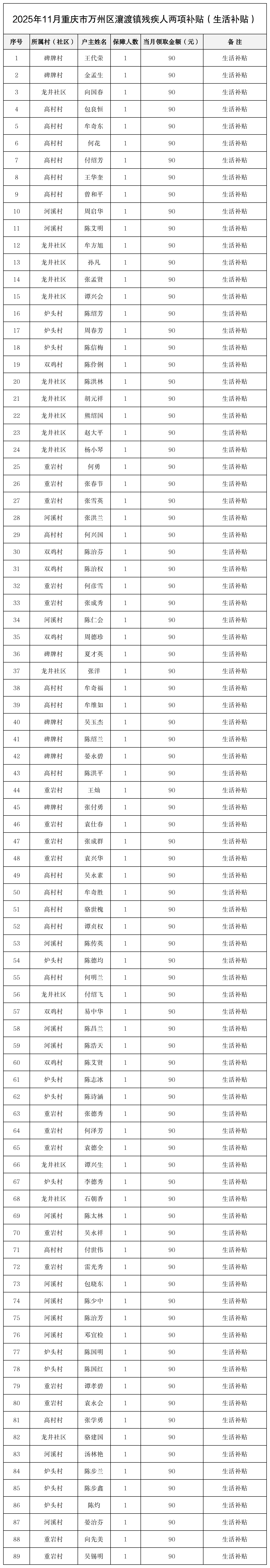 2025年11月重庆市万州区瀼渡镇残疾人两项补贴(生活补贴)