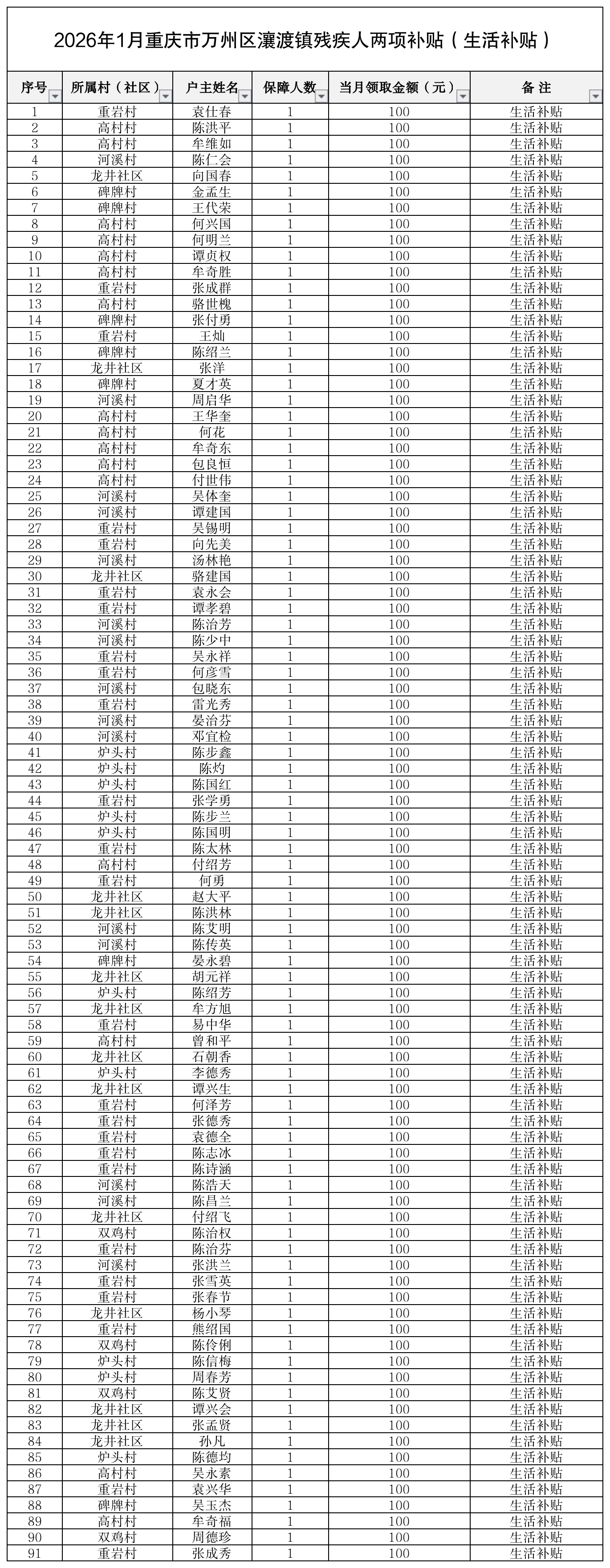 2026年1月重庆市万州区瀼渡镇残疾人两项补贴(生活补贴)