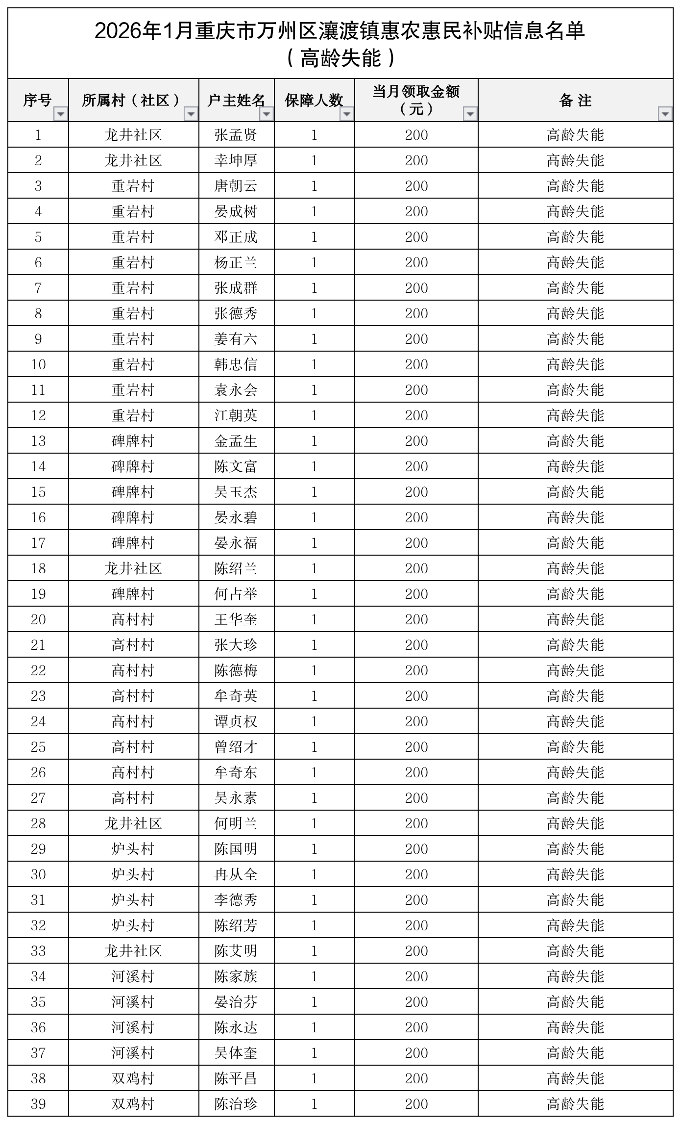 2026年2月重庆市万州区瀼渡镇惠农惠民补贴信息名单(高龄失能)