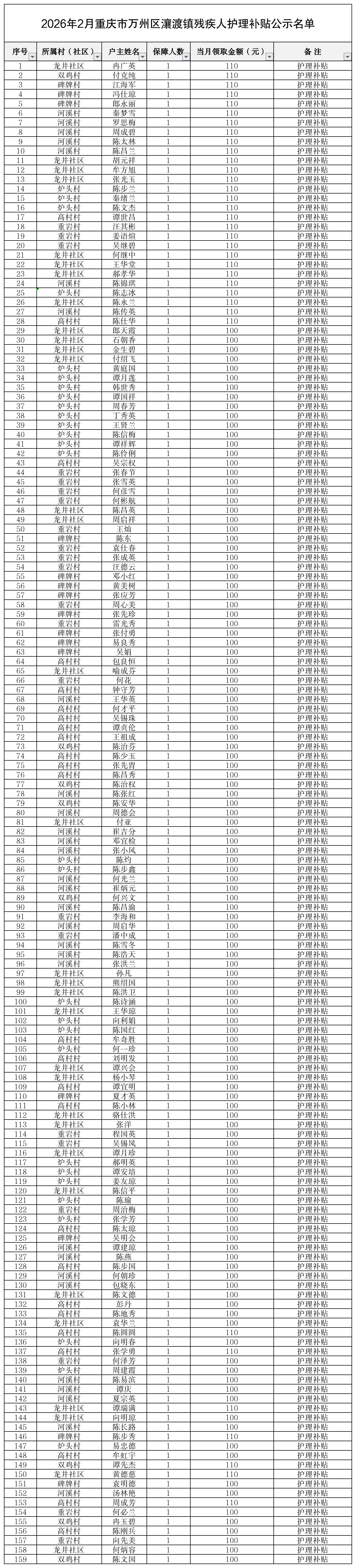 2026年2月重庆市万州区瀼渡镇残疾人两项补贴(护理补贴)