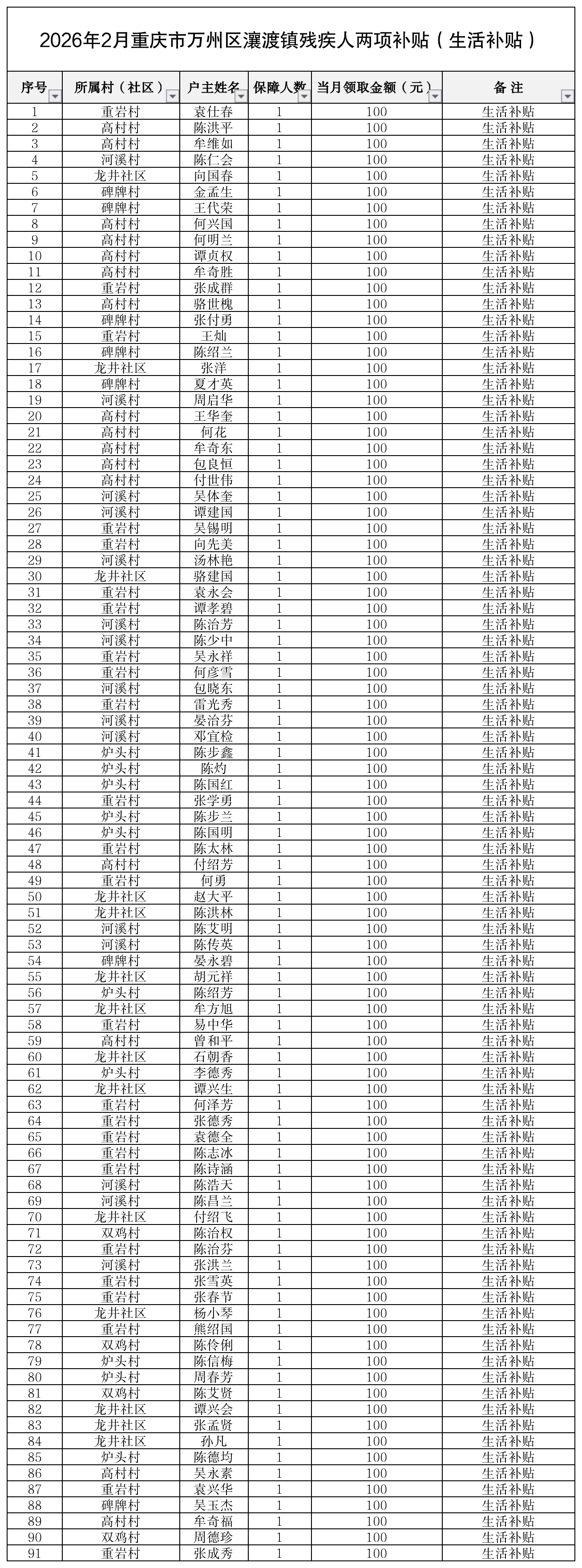 2026年2月重庆市万州区瀼渡镇残疾人两项补贴(生活补贴)