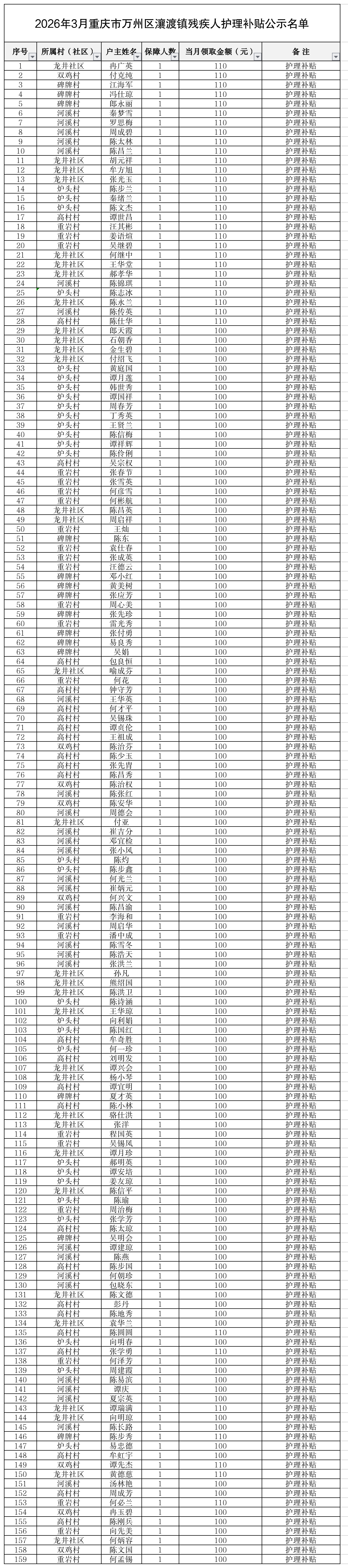 2026年3月重庆市万州区瀼渡镇残疾人两项补贴(护理补贴)