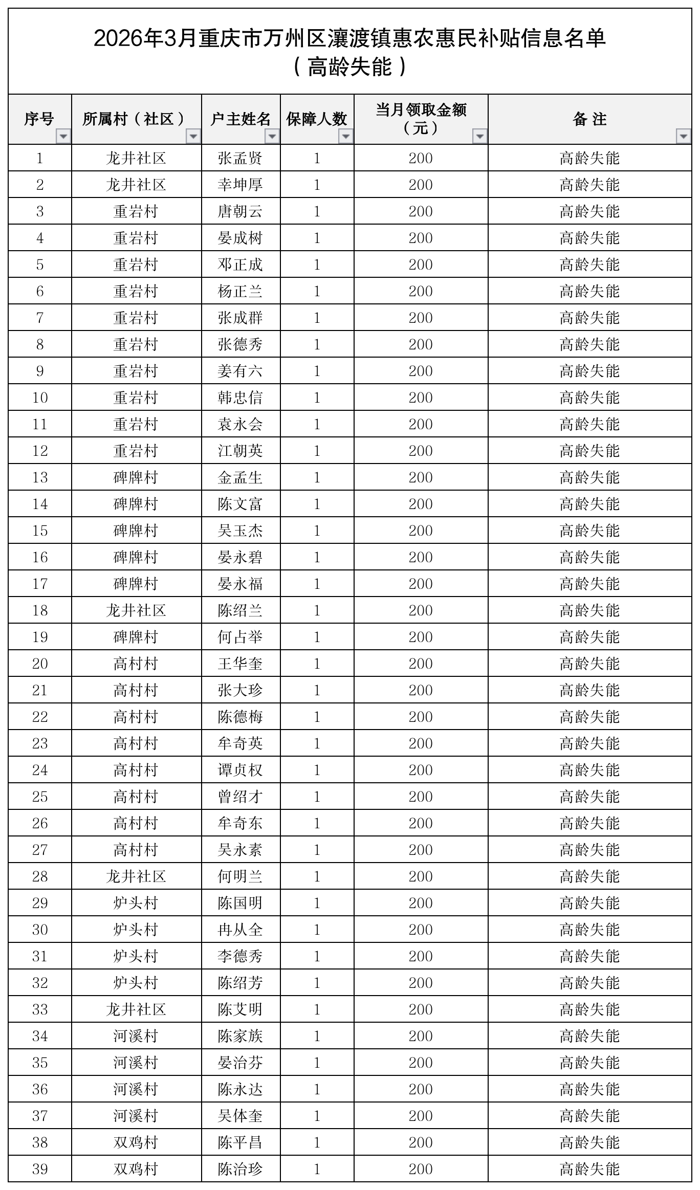 2026年3月重庆市万州区瀼渡镇惠农惠民补贴信息名单(高龄失能)