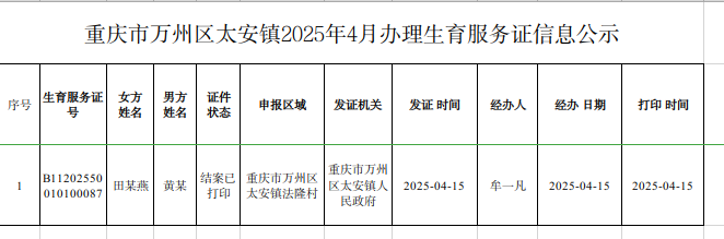 重庆市万州区太安镇2025年4月办理生育服务证信息公示