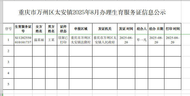 重庆市万州区太安镇2025年8月办理生育服务证信息公示