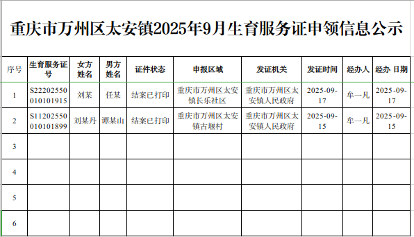 重庆市万州区太安镇2025年9月生育服务证申领信息公示