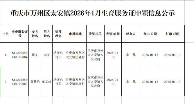 重庆市万州区太安镇2026年1月生育服务证申领信息公示