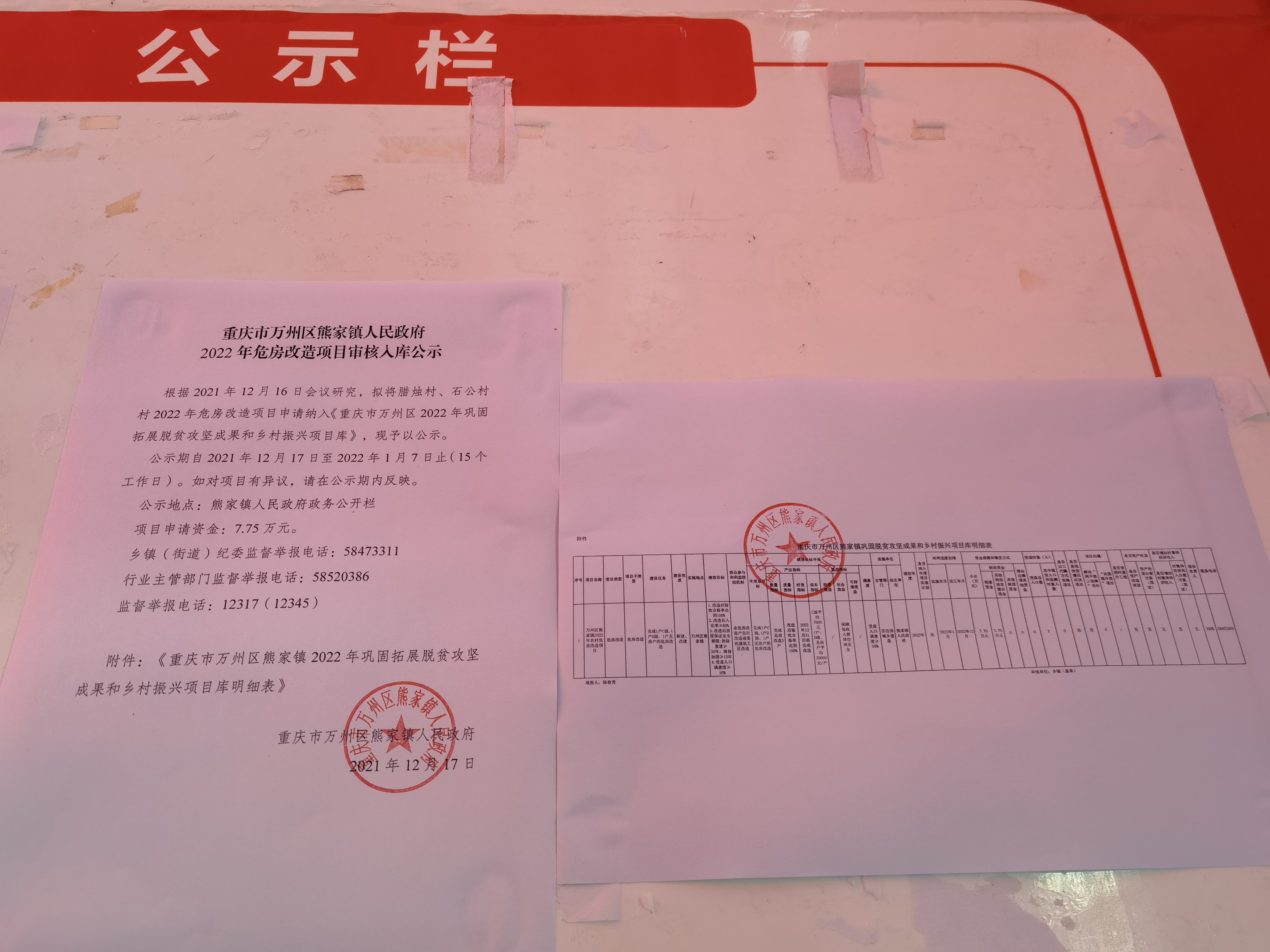 重庆市万州区熊家镇关于农村危房改造的公开公示栏
