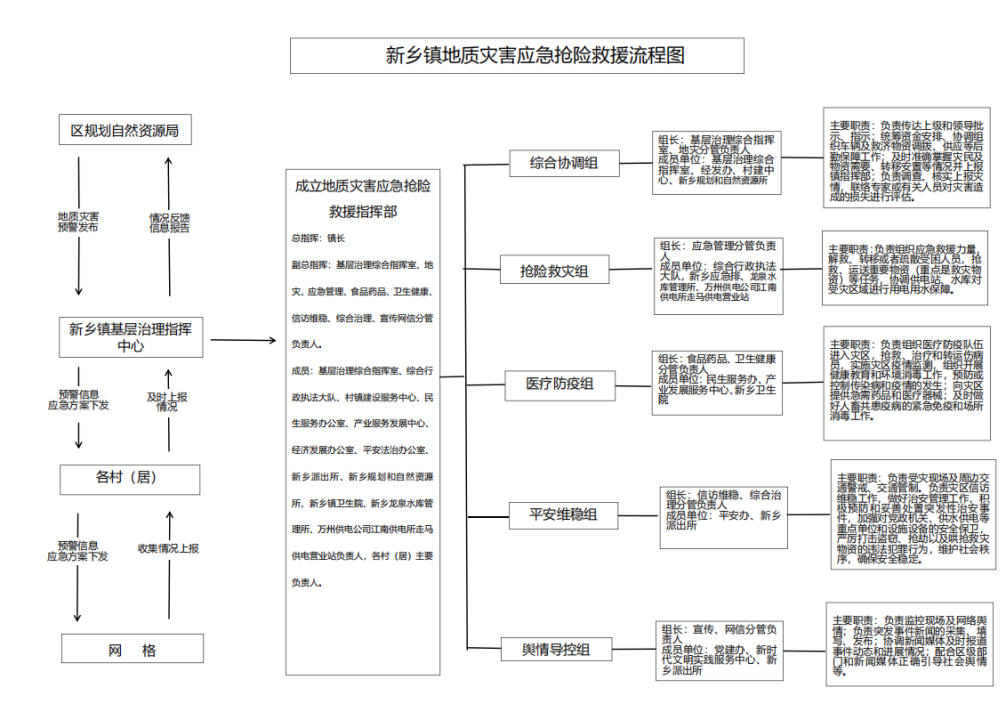 新乡镇地质灾害应急抢险指挥部下设综合协调组、抢险救灾组、医疗防疫组、平安维稳组、舆情导控组等五个小组。由地质灾害应急抢险总指挥长或授权的副指挥长统一指挥。
