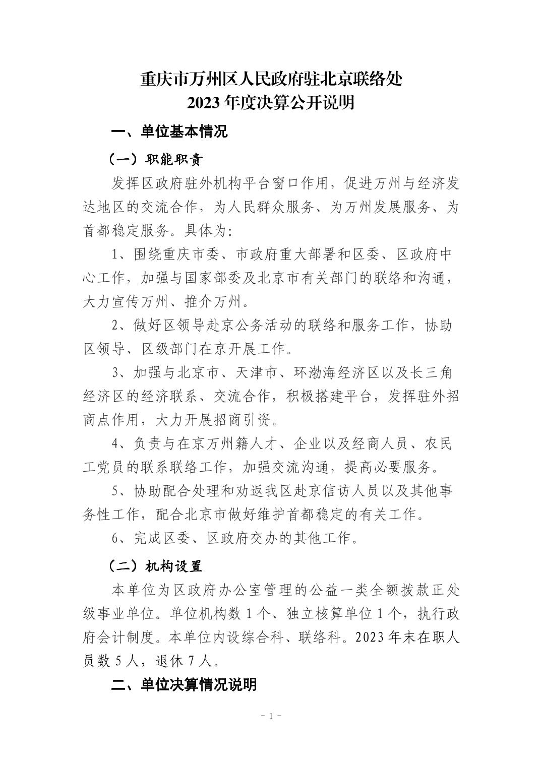 重庆市万州区人民政府驻北京联络处2023年度决算公开说明