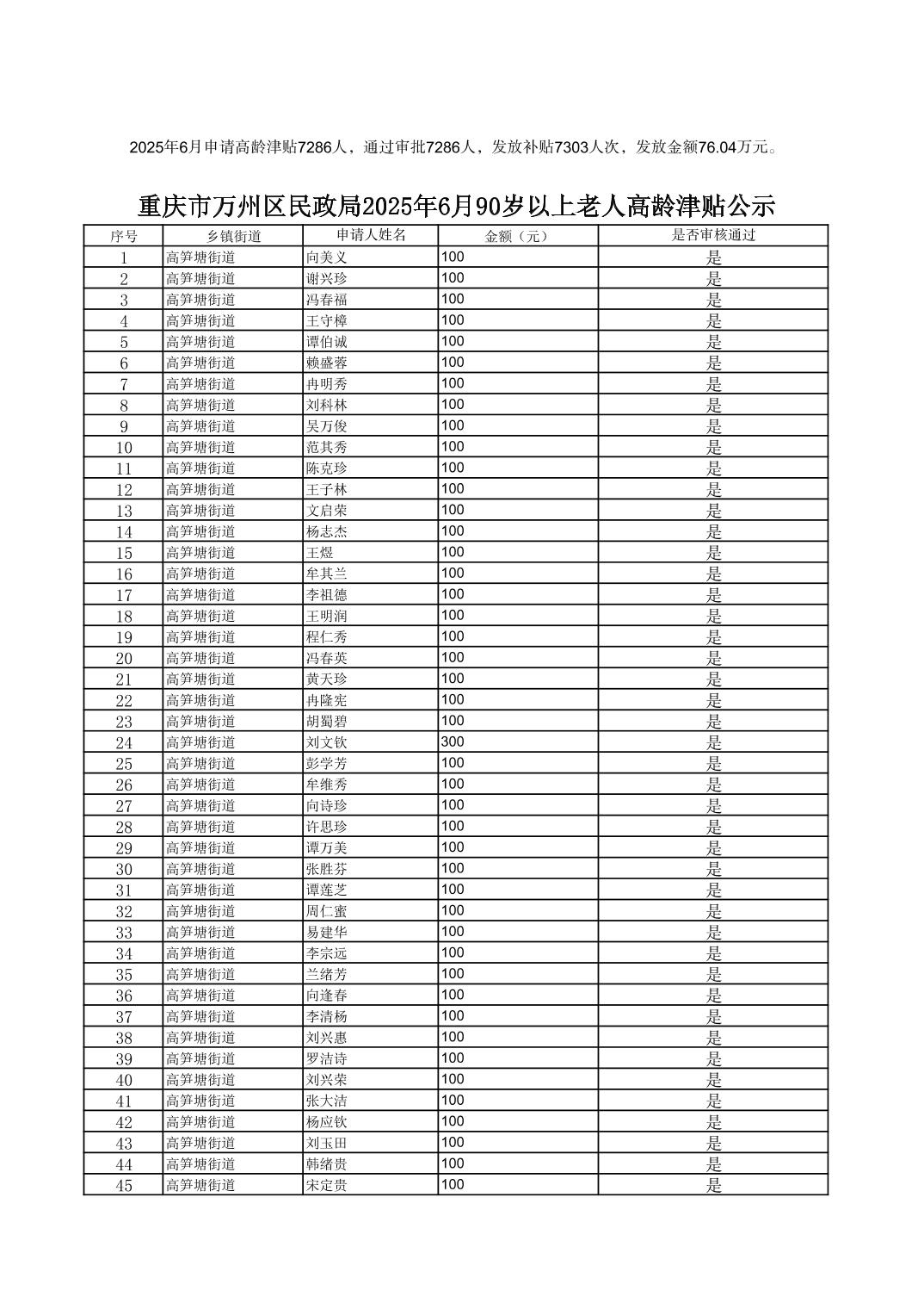 重庆市万州区民政局2025年5-7月90岁以上老人高龄津贴公示