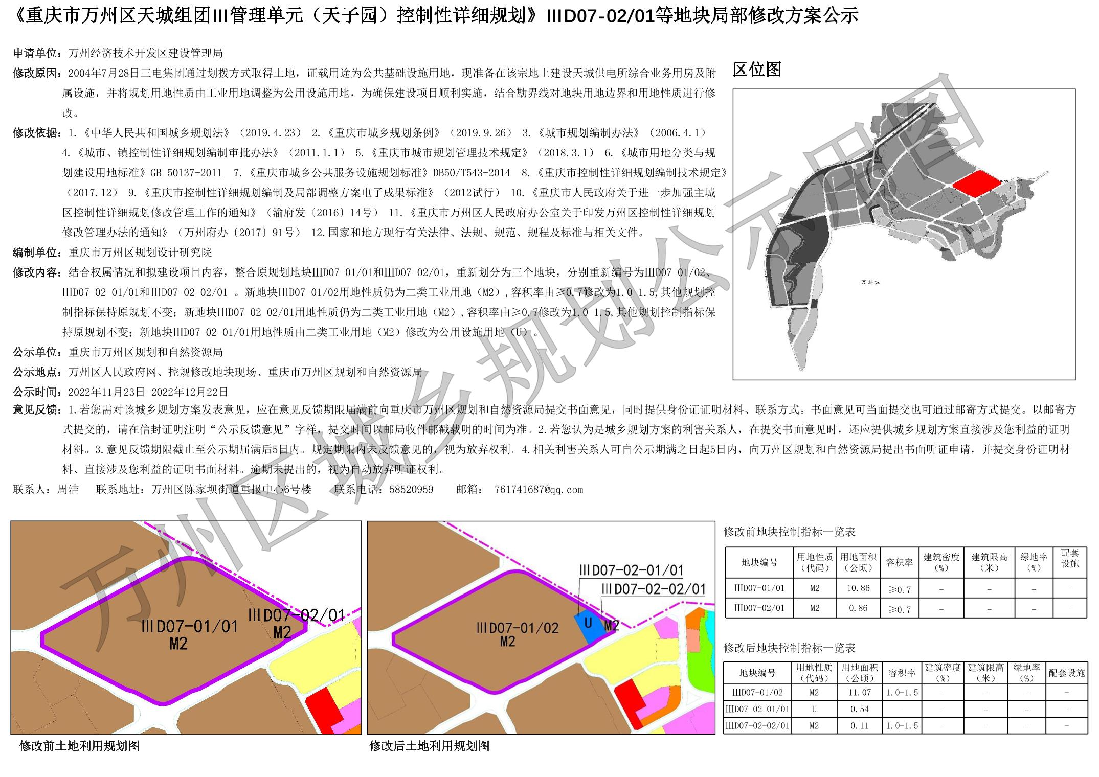 《重庆市万州区天城组团Ⅲ管理单元(天子园)控制性详细规划》ⅢD07-0201等地块局部修改方案公示
