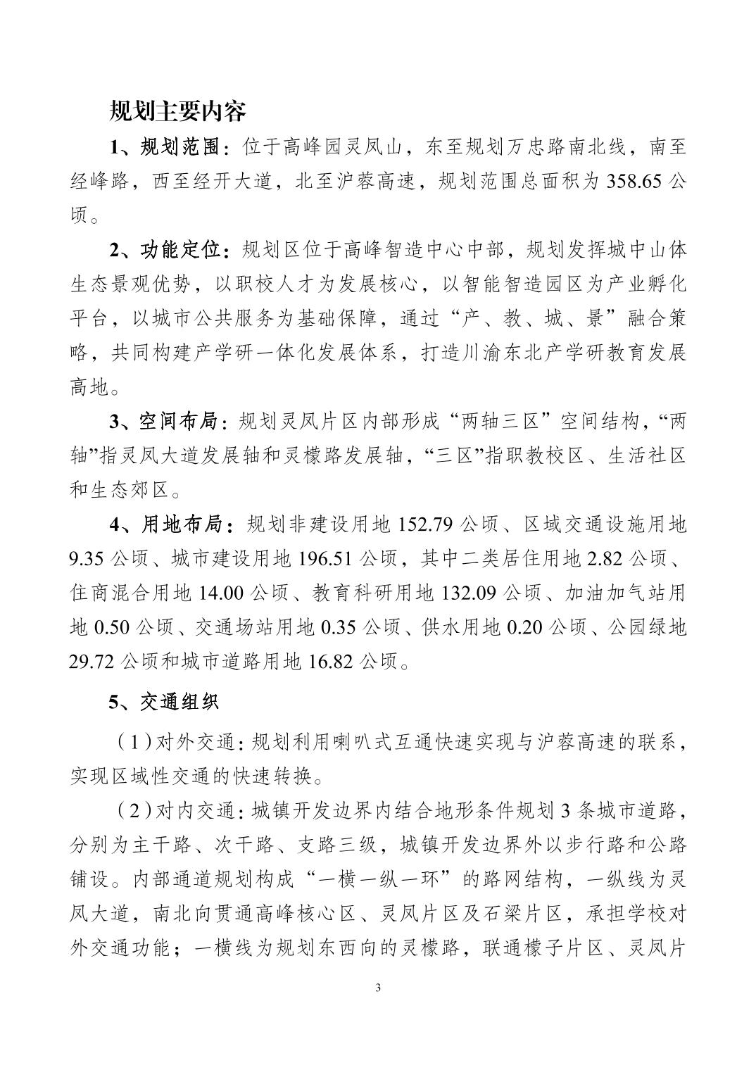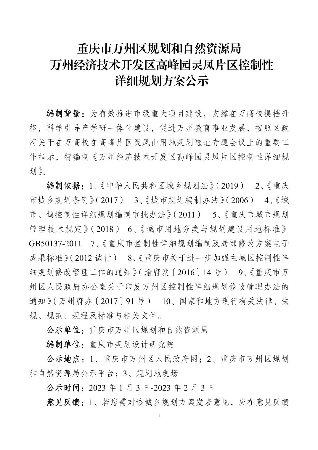 重庆市万州区规划和自然资源局万州经济技术开发区高峰园灵凤片区控制性详细规划方案公示