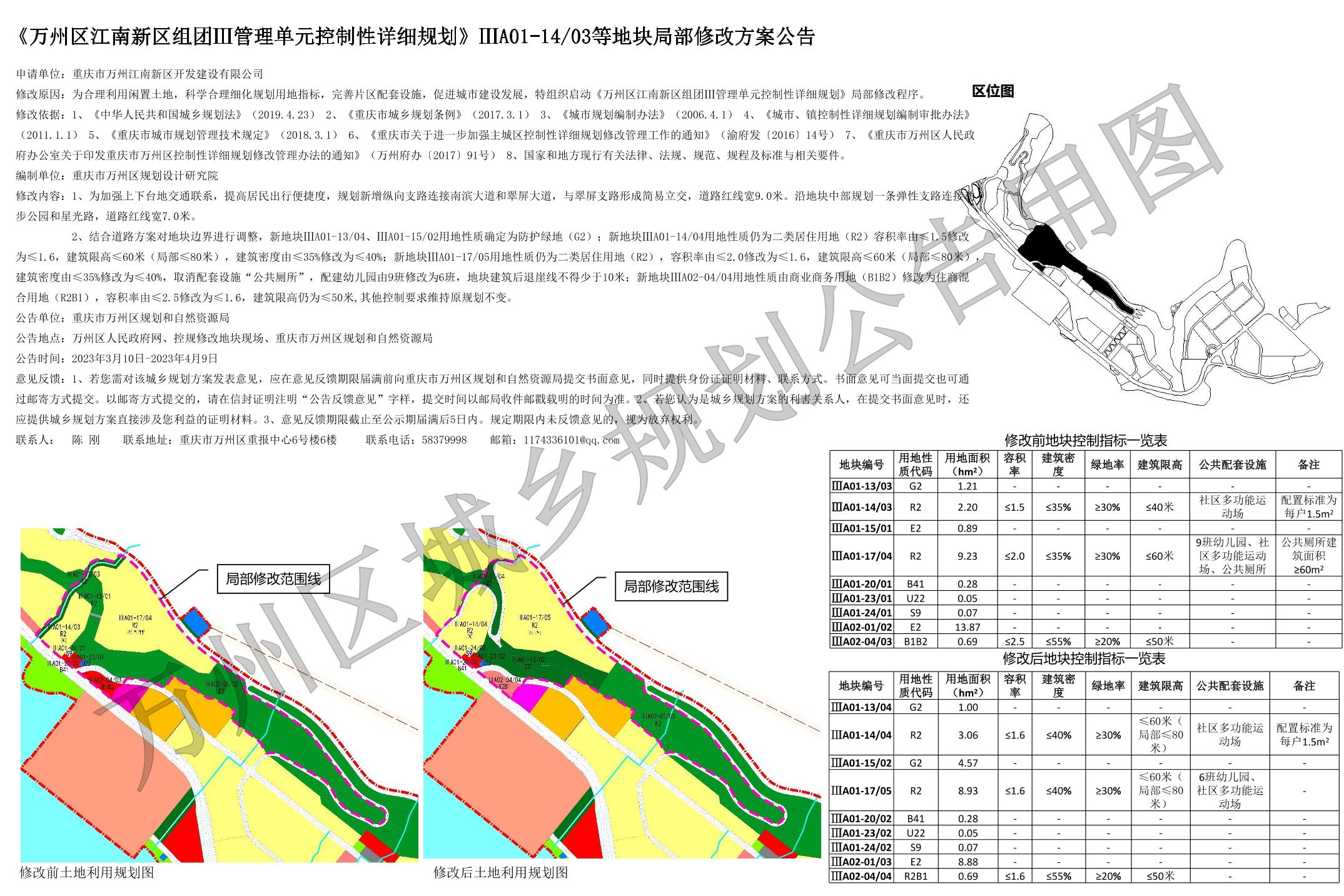 《万州区江南新区组团Ⅲ管理单元控制性详细规划》ⅢA01-1403等地块局部修改方案公告