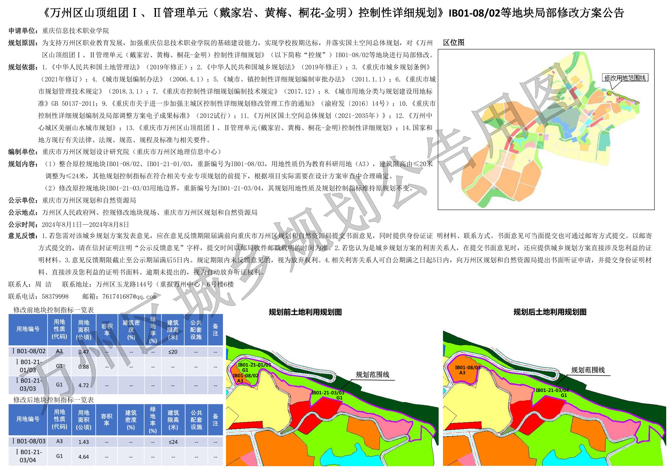重庆市万州区规划和自然资源局《万州区山顶组团Ⅰ、Ⅱ管理单元(戴家岩、黄梅、桐花-金明)控制性详细规划》IB01-0802等地块局部修改方案公告.pdf