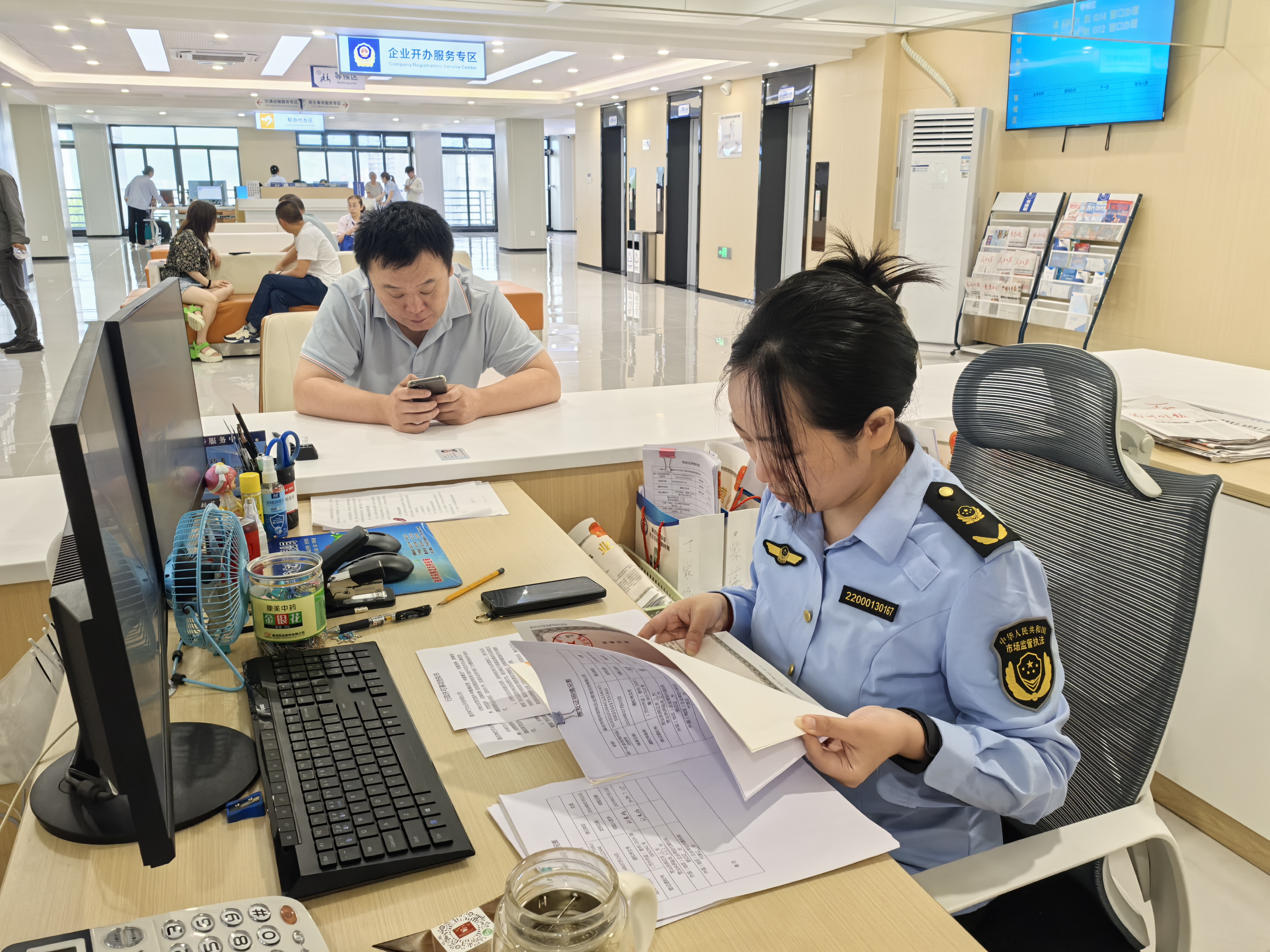 2024年7月15日,区市场监管局工作人员在政务窗口为企业办理营业执照。
