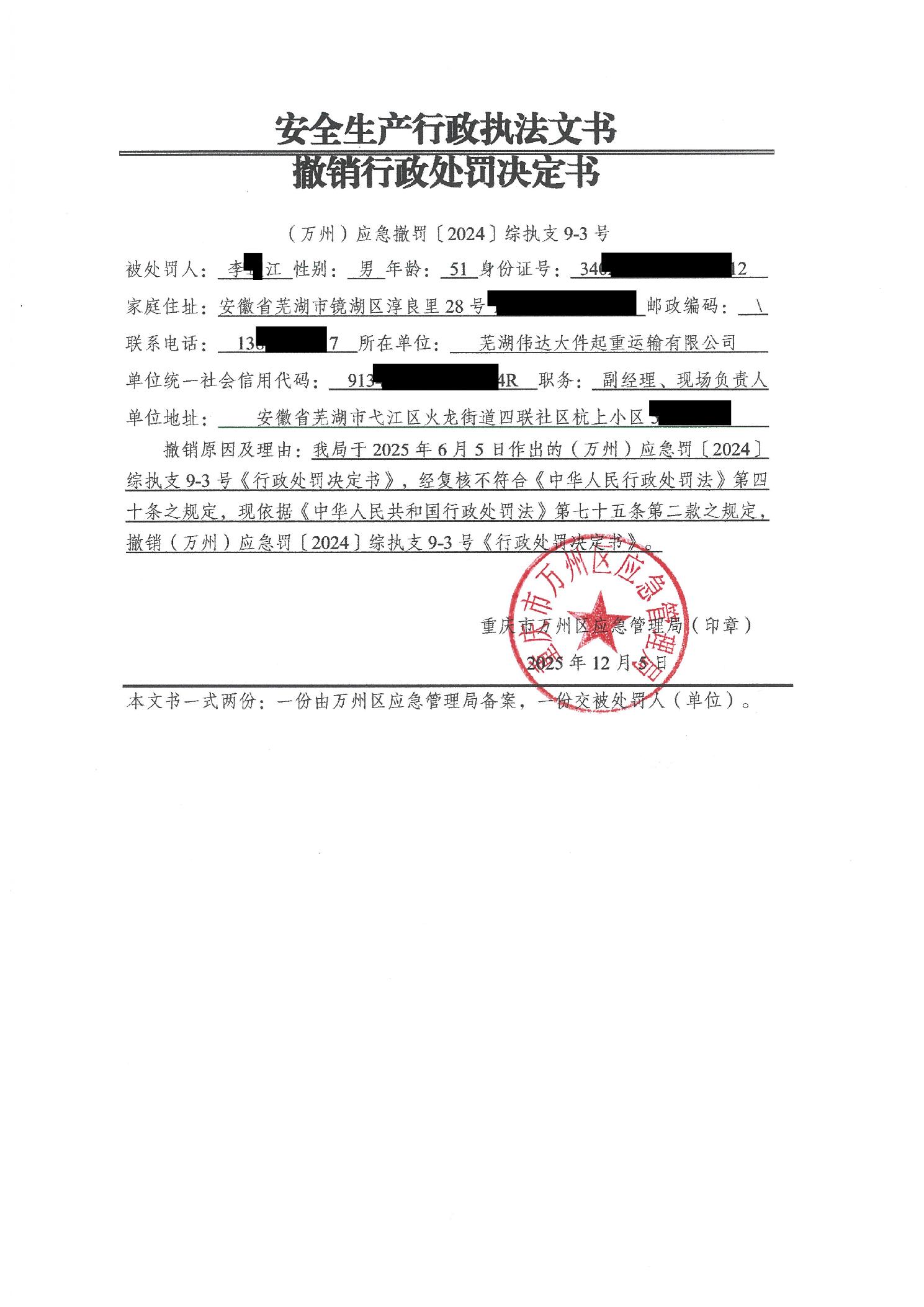 重庆市万州区应急管理局撤销行政处罚决定书(万州应急撤罚〔2024〕综执支9-3号)