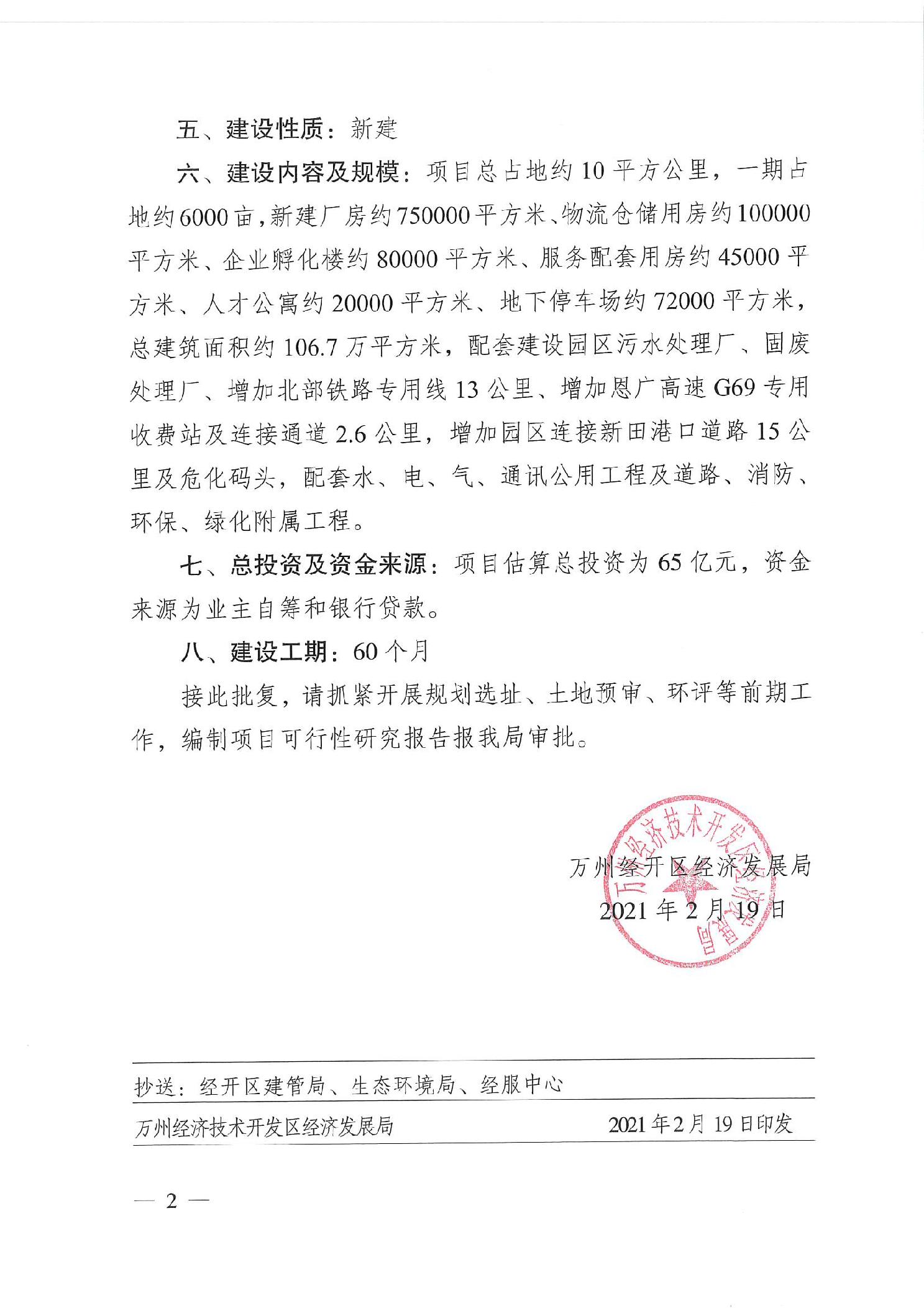 万州经济技术开发区经济发展局关于万州化工园暨绿色循环产业园项目建议书的批复