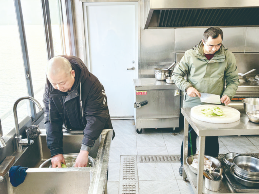 兄弟俩在趸船的厨房里做饭。