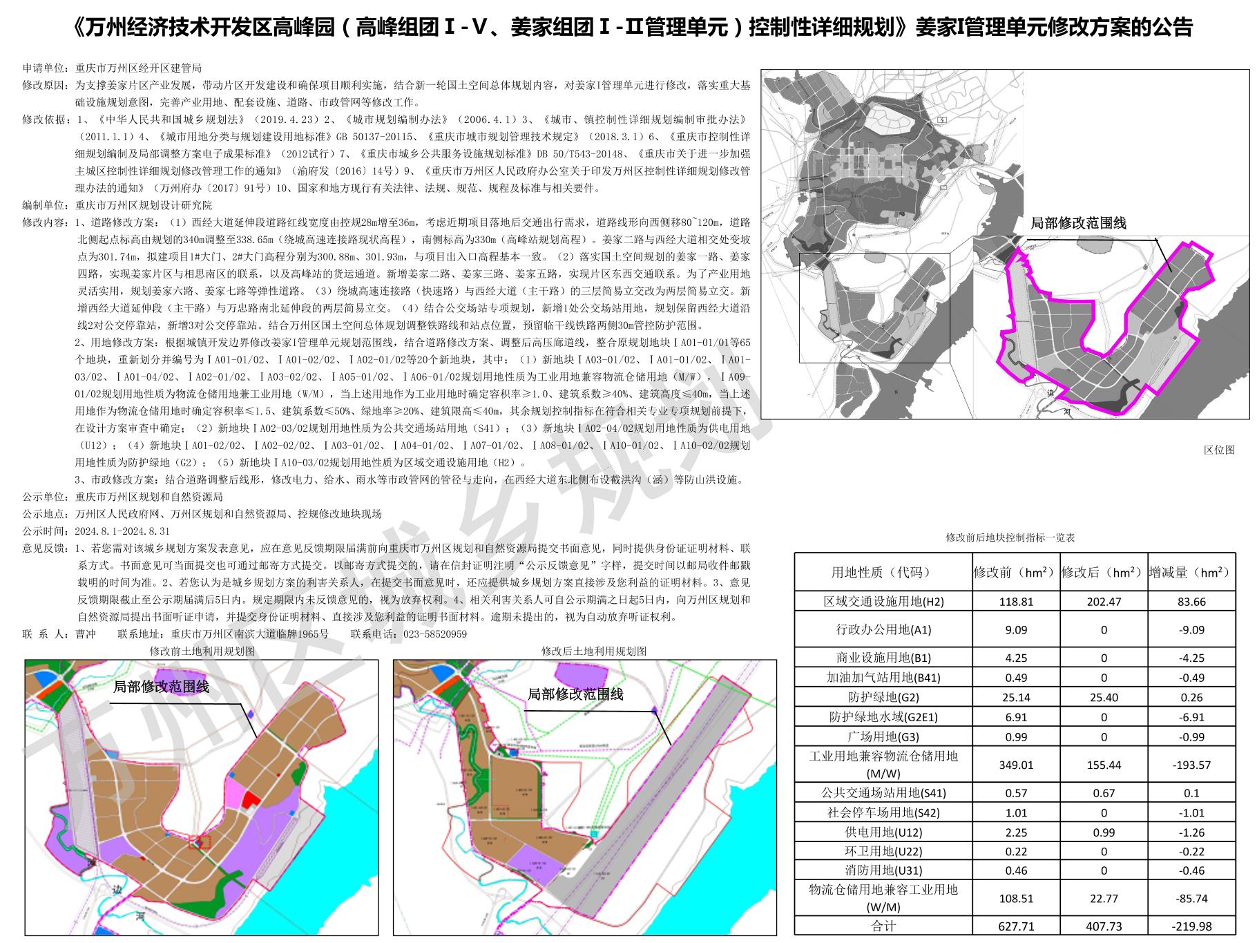 重庆市万州区规划和自然资源局《万州经济技术开发区高峰园(高峰组团Ⅰ-Ⅴ、姜家组团Ⅰ-Ⅱ管理单元)控制性详细规划》姜家I管理单元修改方案的公告